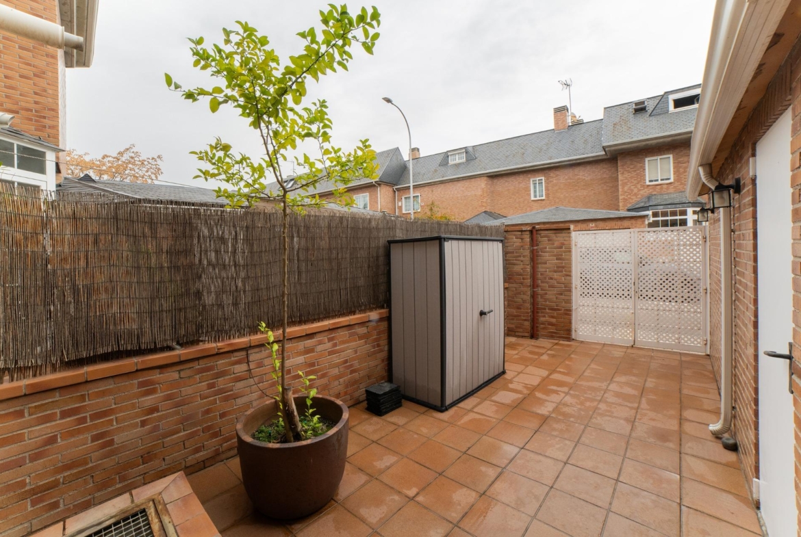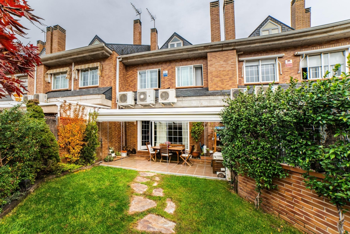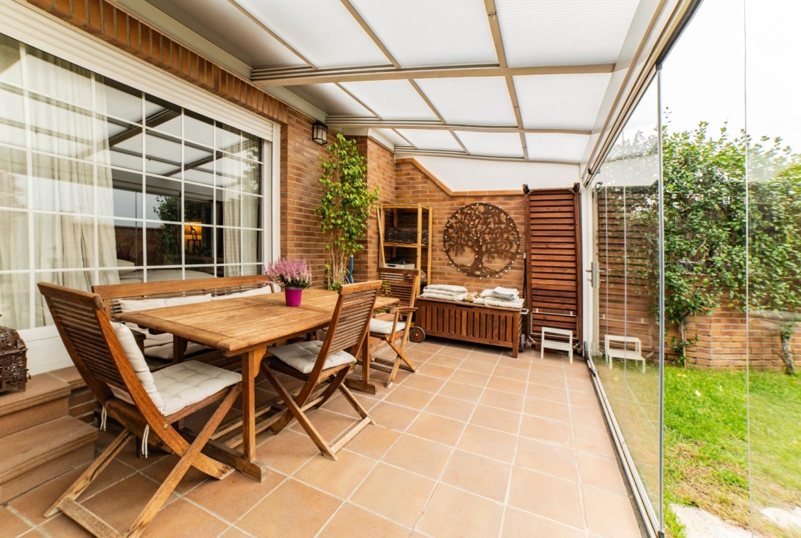 El jardín cuenta con una terraza con cerramiento de aluminio con techo móvil y frontal acristalado con llave, dotado con un sistema de riego automático y una Barbacoa para realizar asados con la familia y amigos.