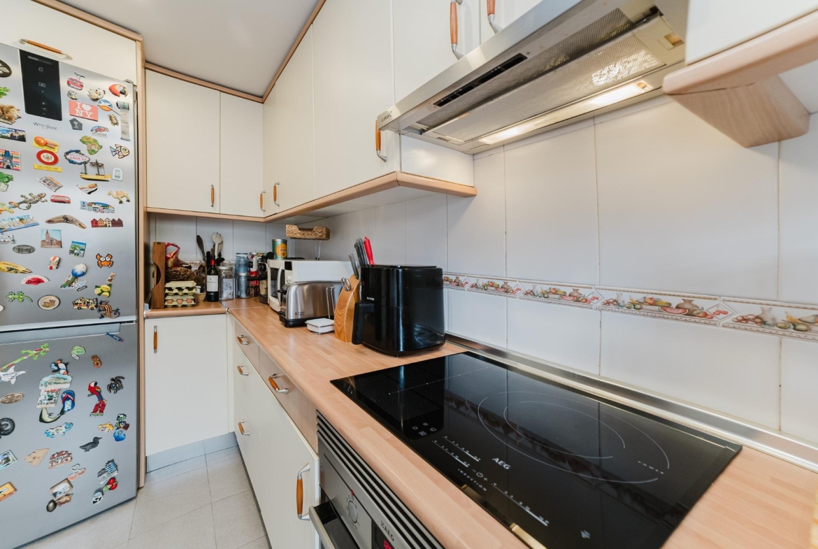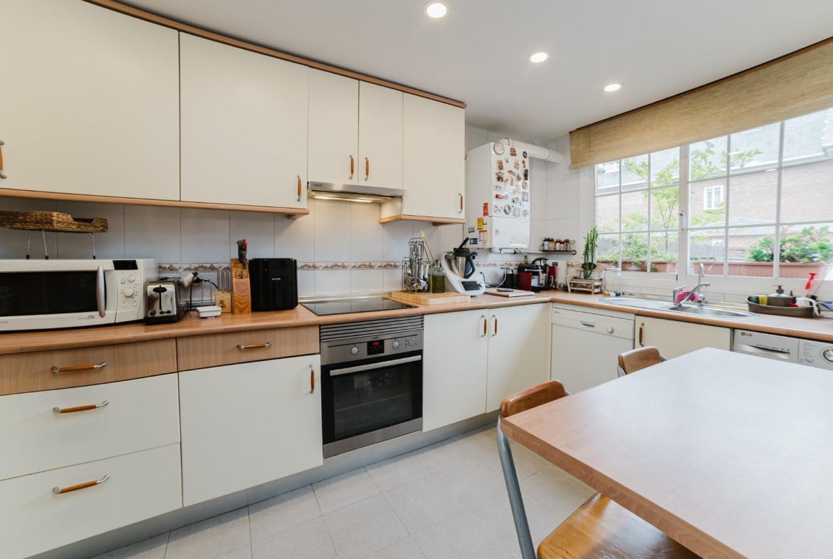 Acceso directo desde la entrada principal y con una entrada independiente acceso a garaje para 1 vehículo de gran tamaño, con puerta automática. La puerta de entrada está blindada y con videoportero. El vestíbulo permite el acceso a la escalera de las plantas superiores. Tiene un aseo. La cocina es independiente y está completamente equipada y tiene orientación Norte. El amplio salón comedor dispone de chimenea-cassette integrada, tiene orientación Sur con vistas al coqueto jardín a través de un gran ventanal.