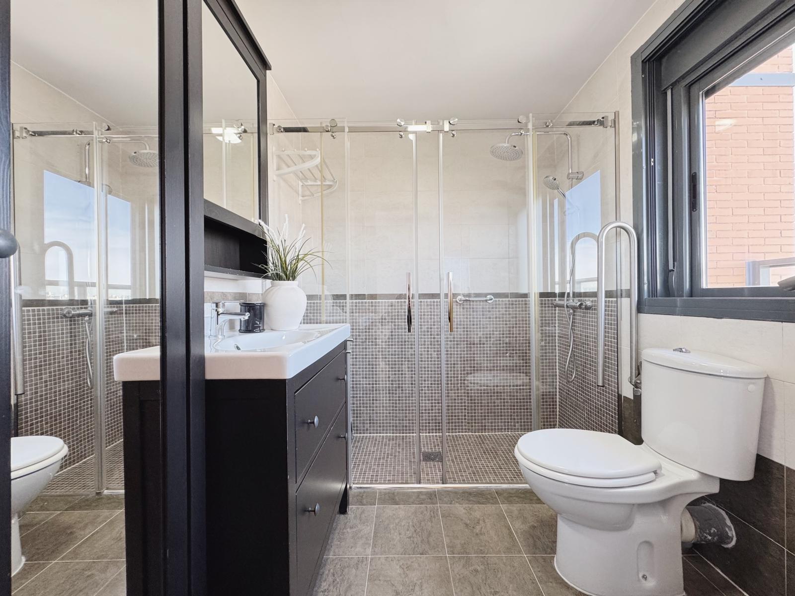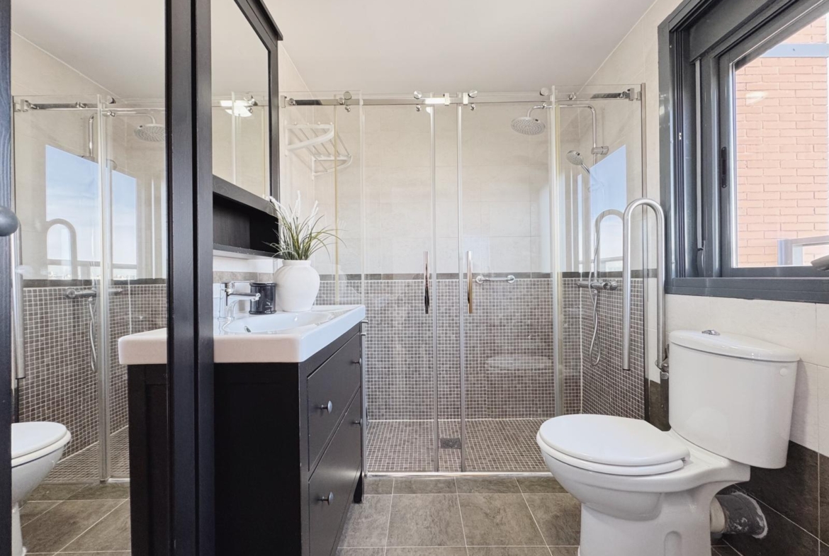 La zona de descanso cuenta con tres dormitorios, bien proporcionados y pensados para el descanso. El dormitorio principal dispone de baño en suite y acceso directo a la terraza, mientras que un segundo baño completo da servicio al resto de la vivienda, ofreciendo comodidad.