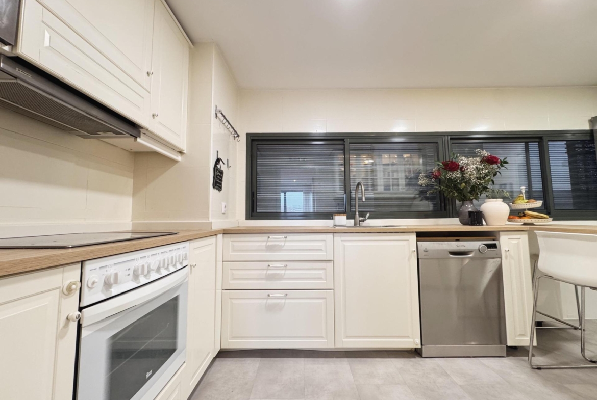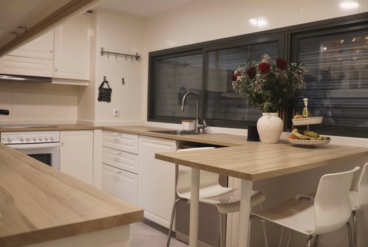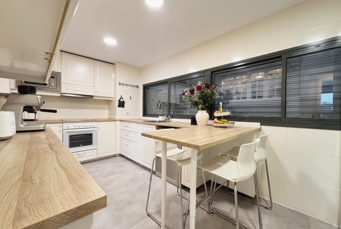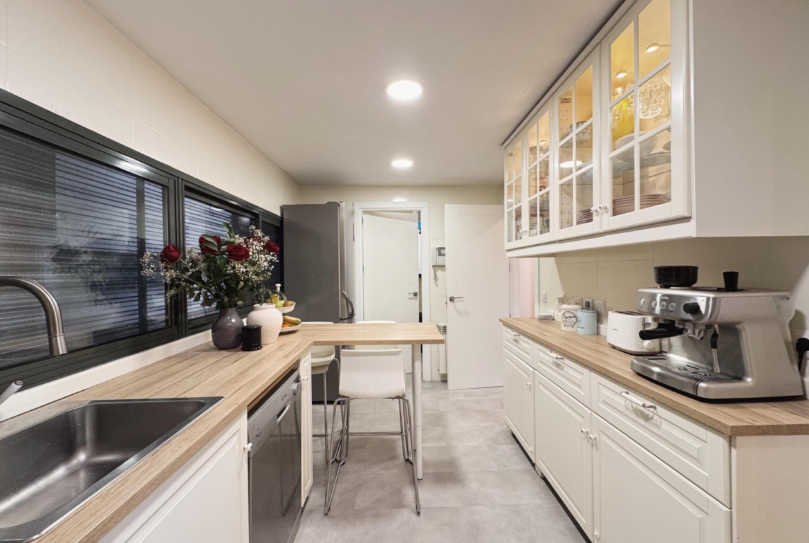 La cocina, de diseño actual, cuenta con península y zona de desayunos, ofreciendo un espacio cómodo y funcional para el uso diario. Dispone además de tendedero independiente, un detalle que aporta orden y funcionalidad a la vivienda.