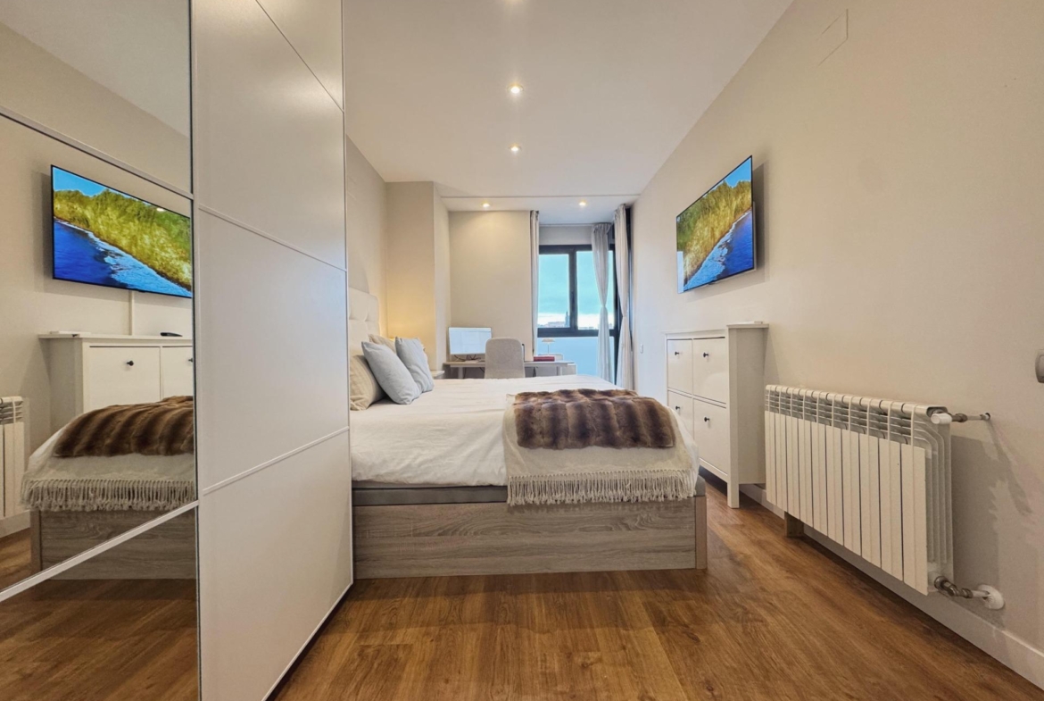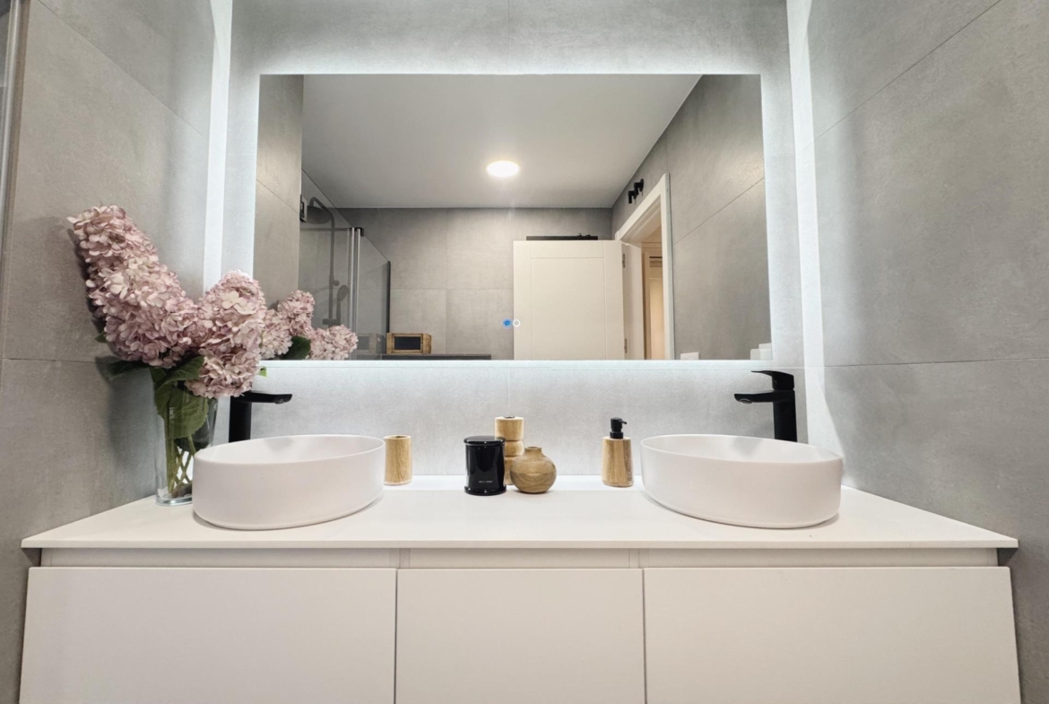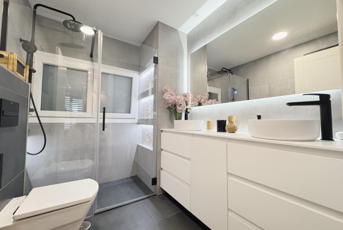 La zona de descanso se compone de tres dormitorios, bien proporcionados y pensados para el descanso. El dormitorio principal cuenta con baño en suite, y la vivienda dispone de un segundo baño completo, ambos totalmente reformados, con materiales contemporáneos y acabados de calidad.