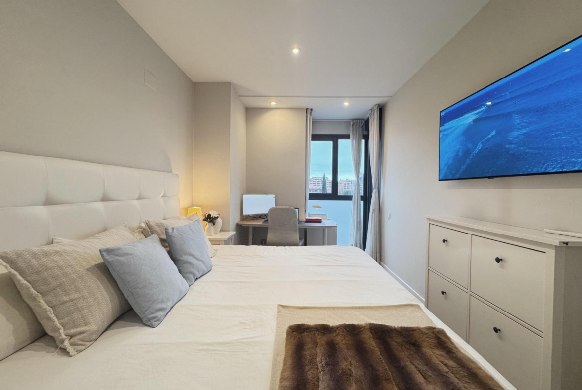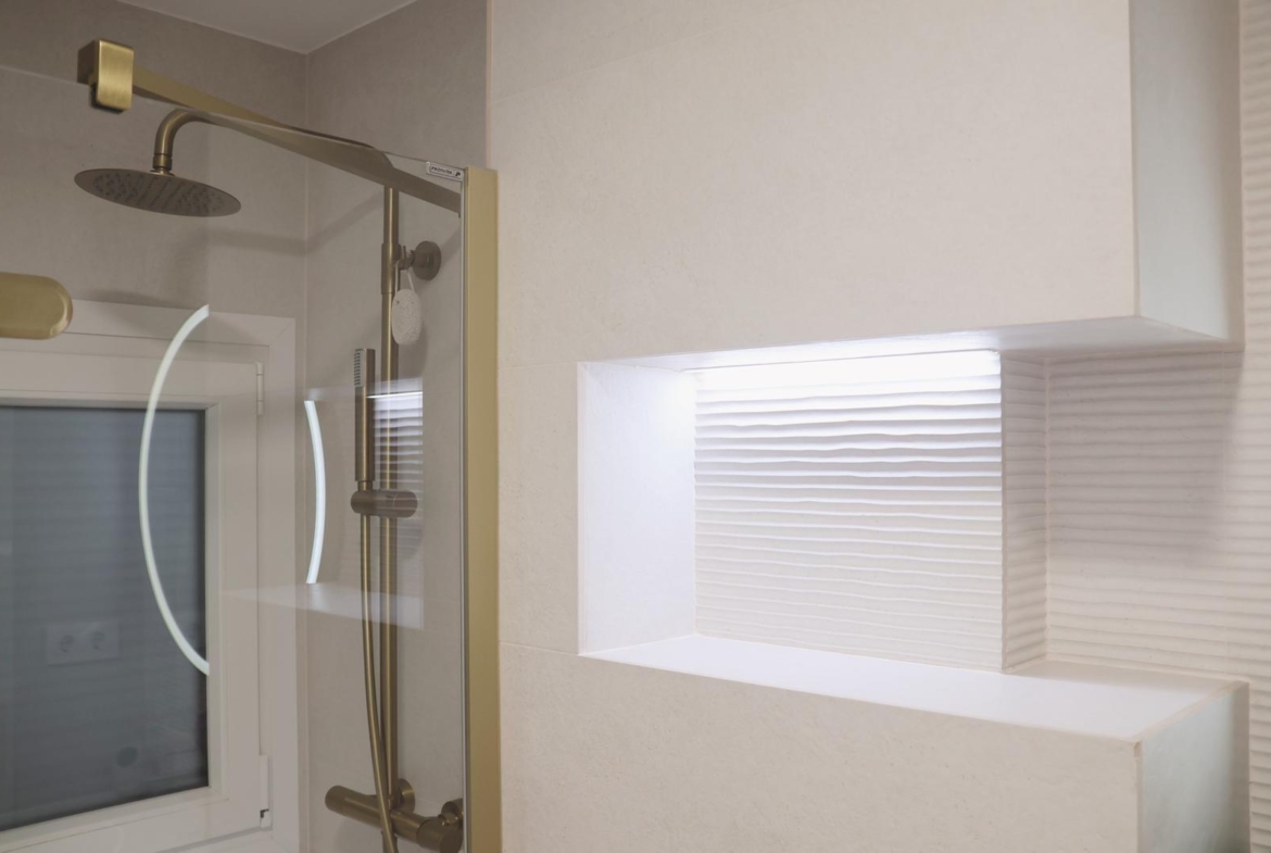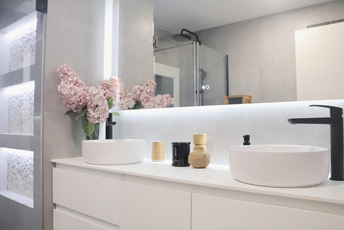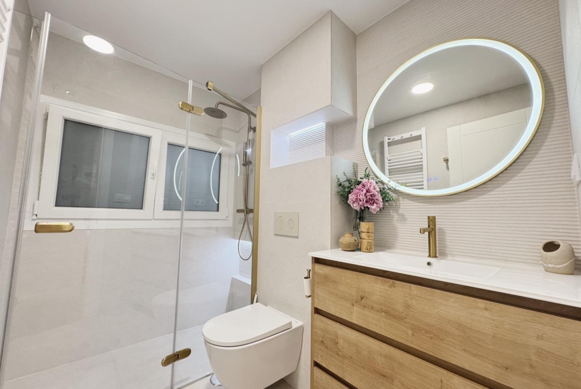 La zona de descanso se compone de tres dormitorios, bien proporcionados y pensados para el descanso. El dormitorio principal cuenta con baño en suite, y la vivienda dispone de un segundo baño completo, ambos totalmente reformados, con materiales contemporáneos y acabados de calidad.