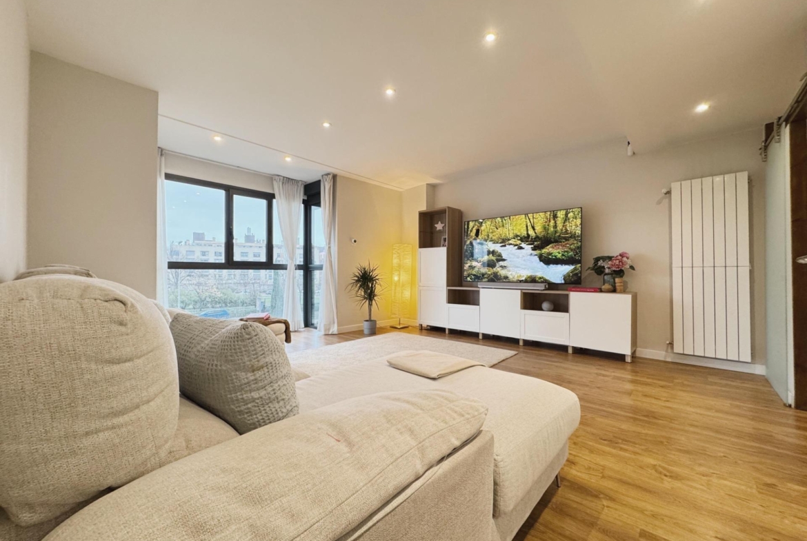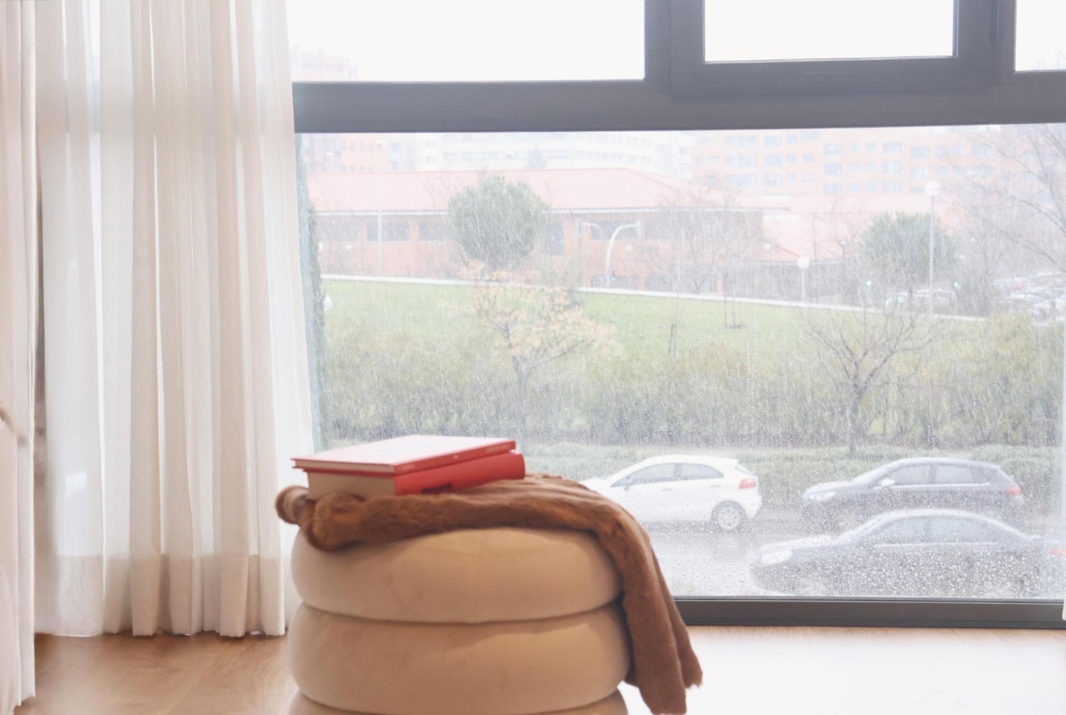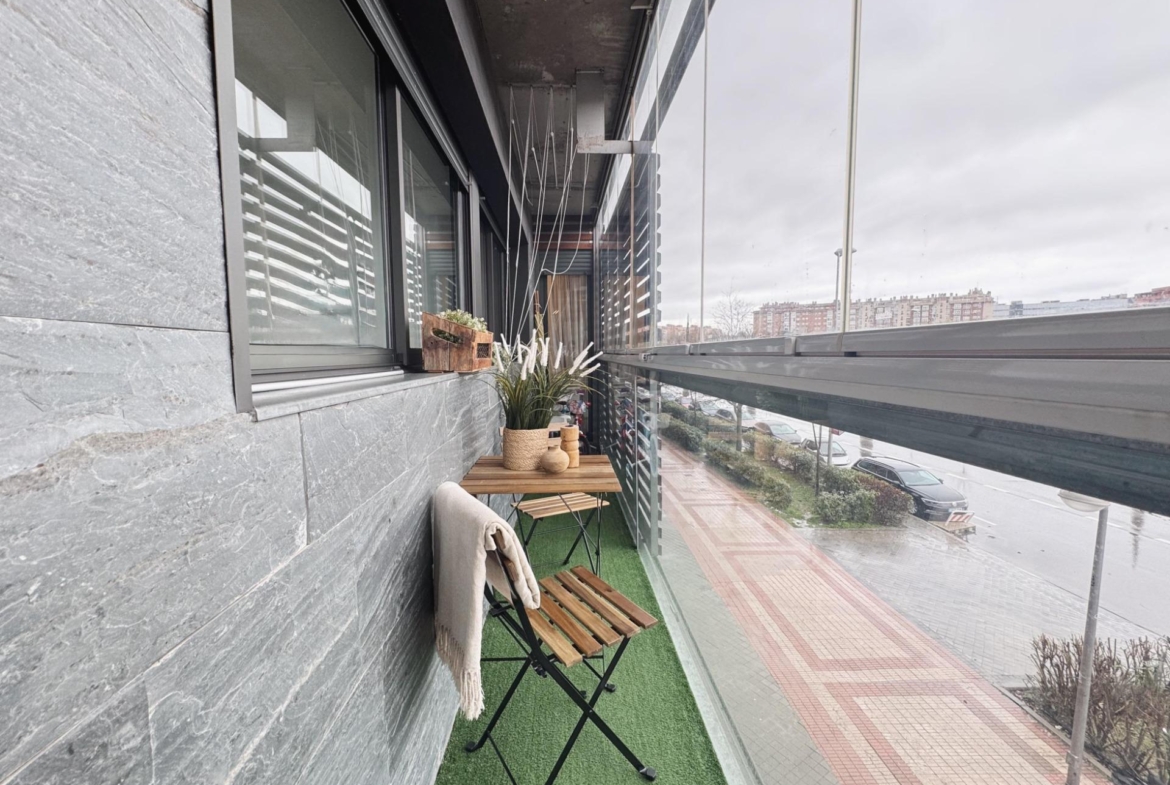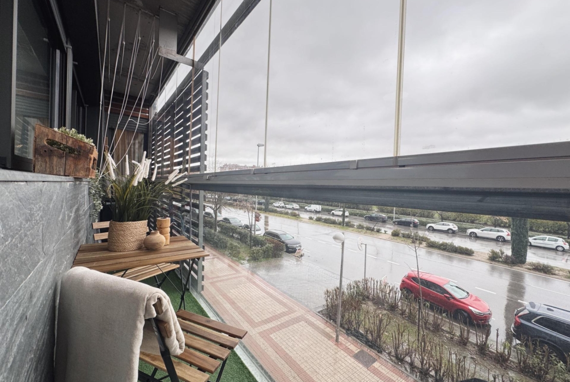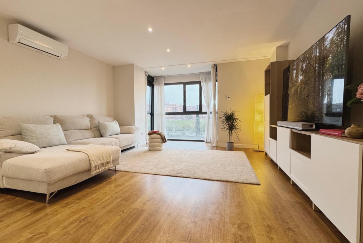 El salón, amplio y bien definido, se configura como el espacio central de la vivienda, permitiendo diferenciar distintos ambientes, y cuenta con acceso directo a la terraza cerrada mediante cortina de cristal Lumon, que amplía el espacio útil y permite su disfrute durante todo el año.