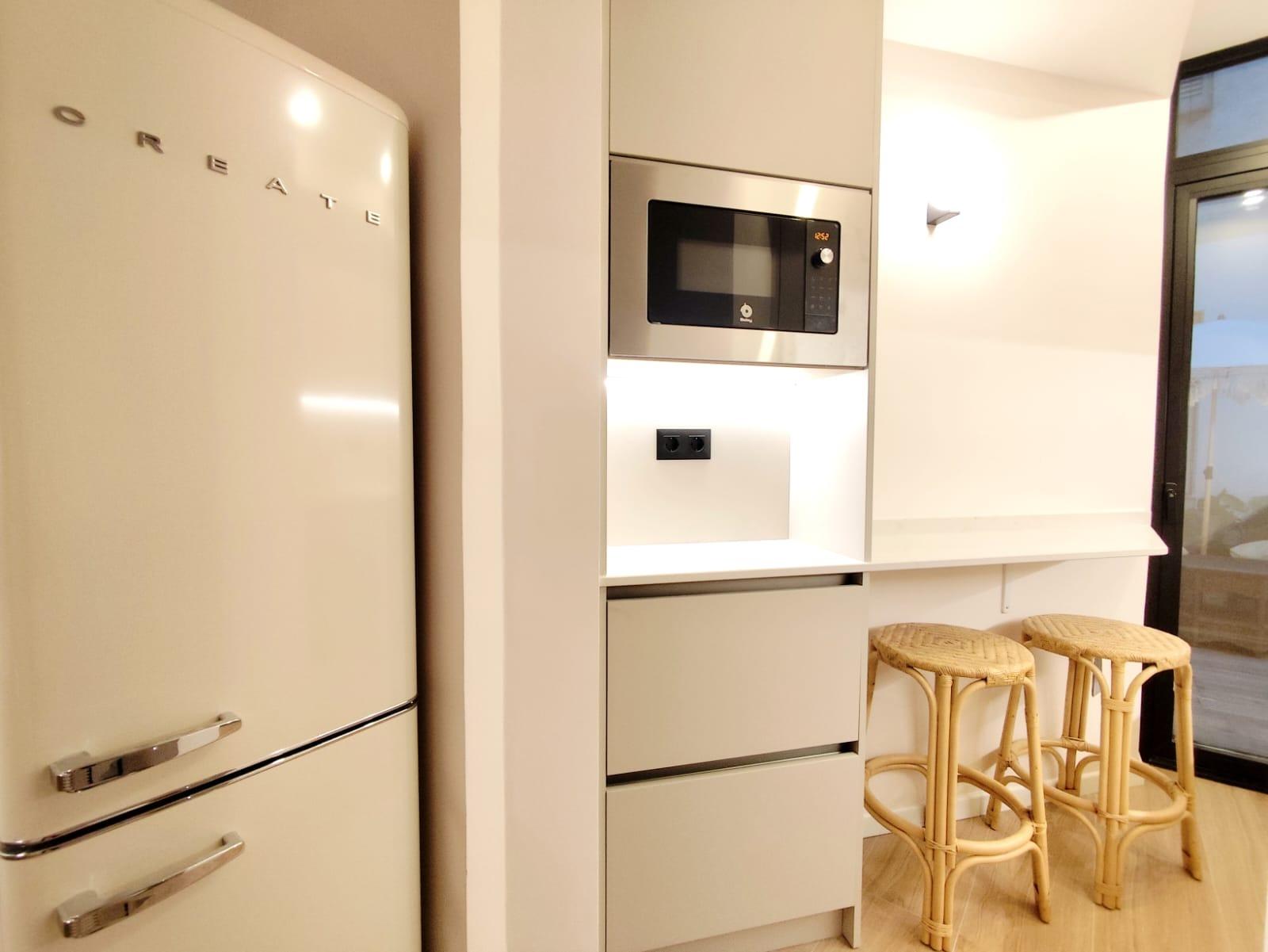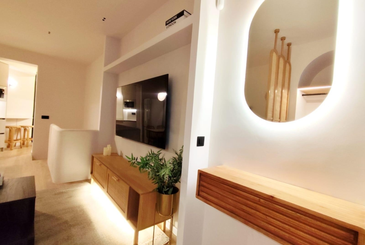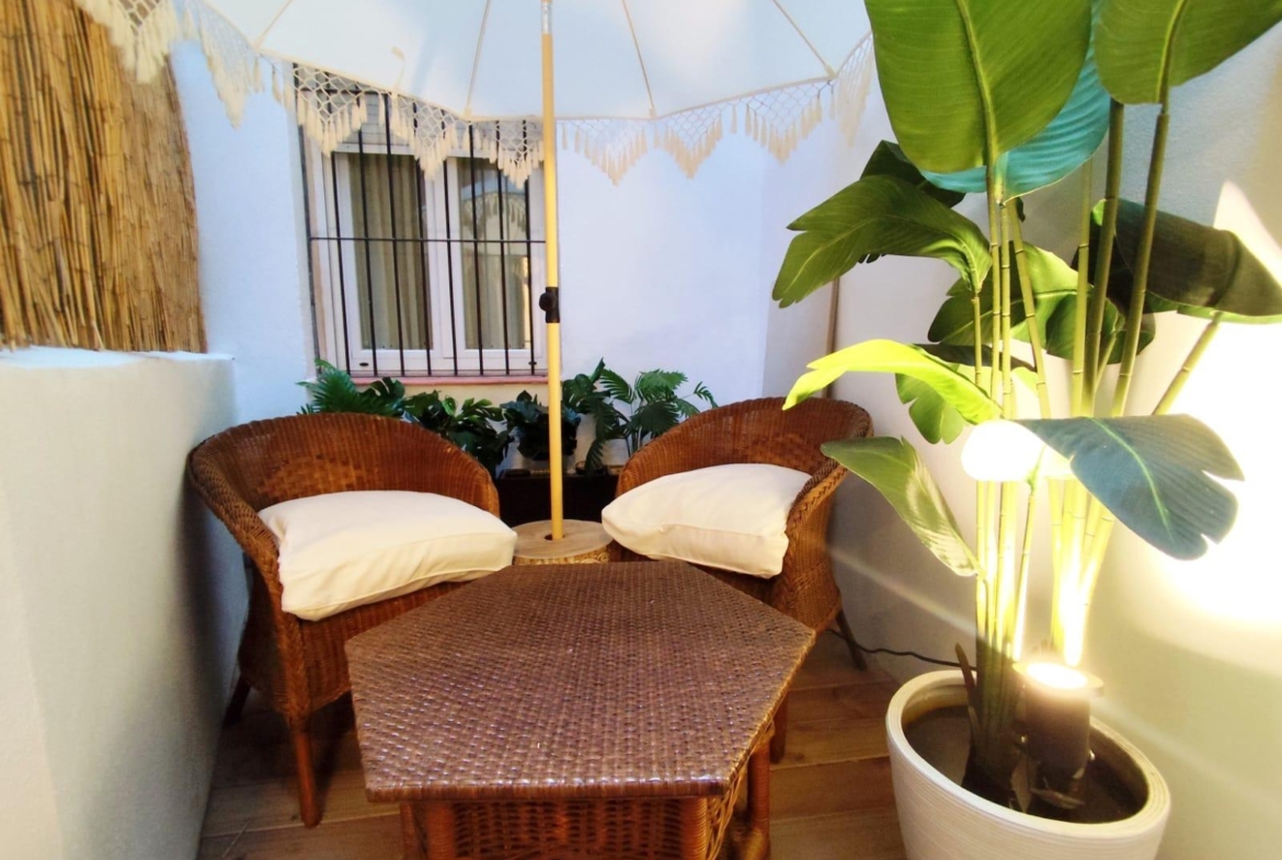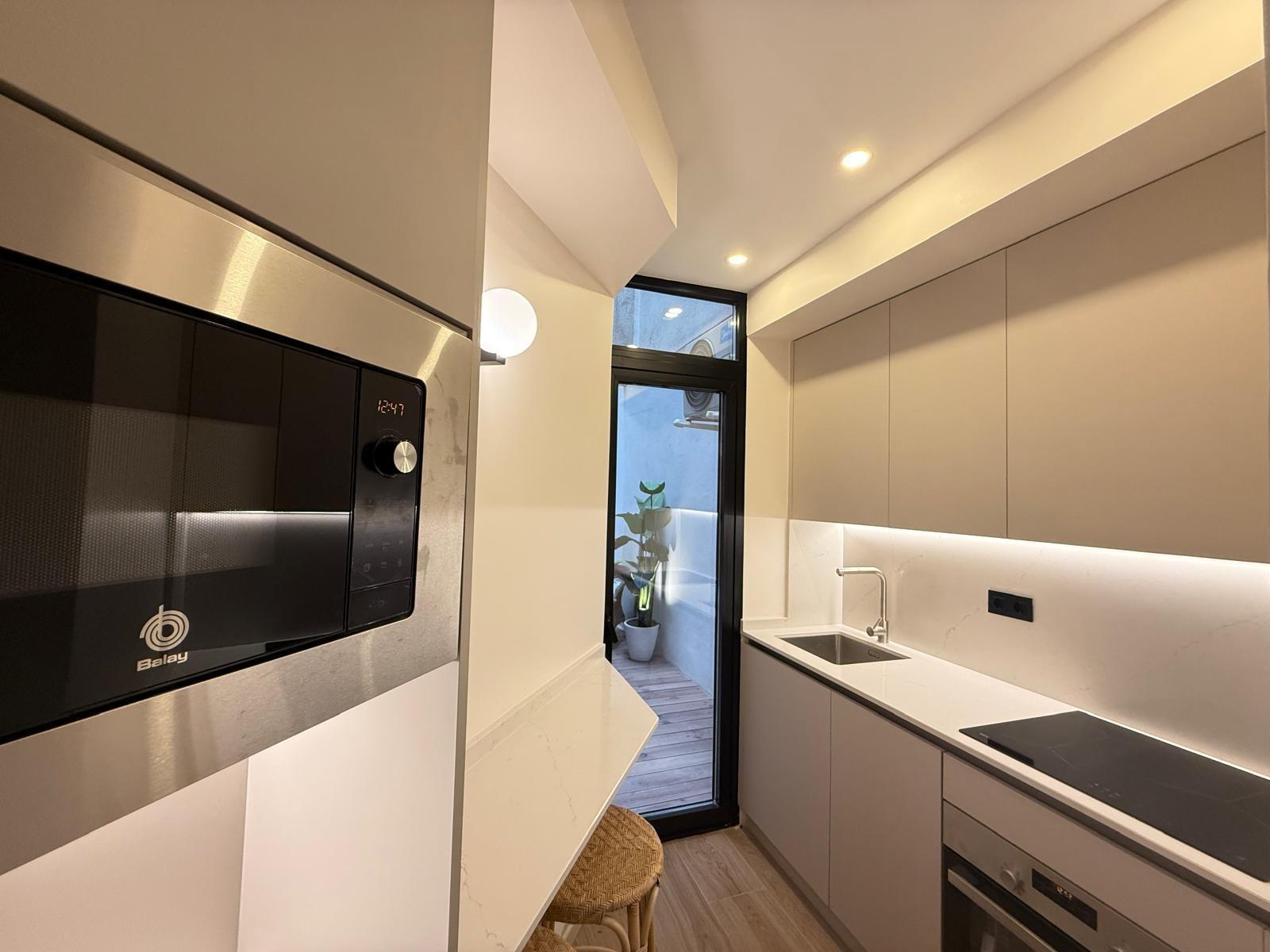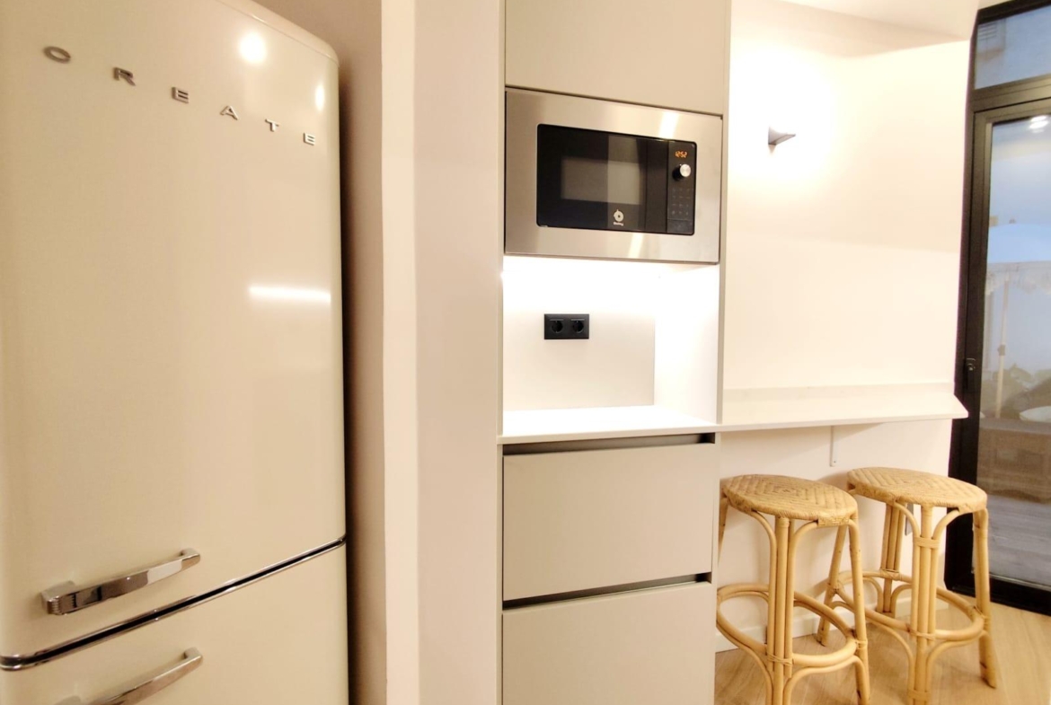 La cocina está completamente equipada con electrodomésticos integrados y mobiliario de diseño, ofreciendo un espacio práctico y preparado para el día a día. Además, el inmueble cuenta con un encantador patio privado, ideal para disfrutar del sol, crear una zona chill-out o incorporar vegetación y decoración exterior.