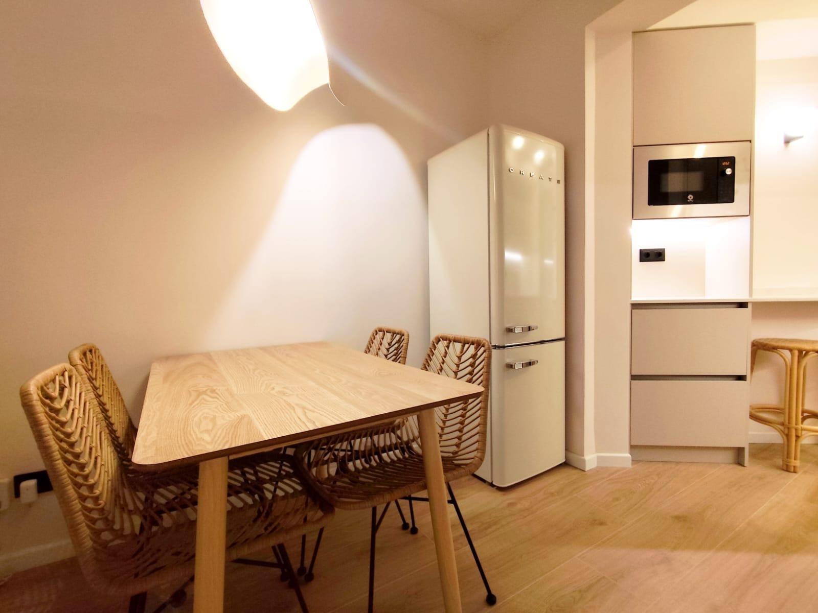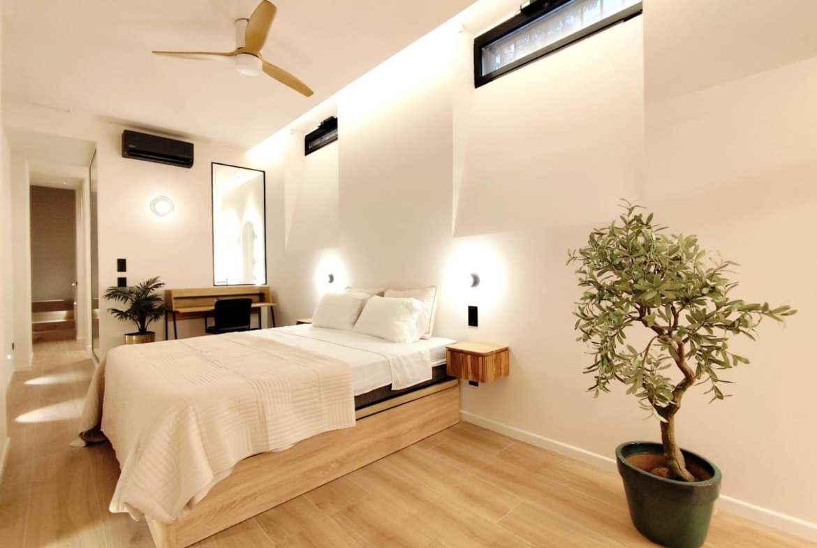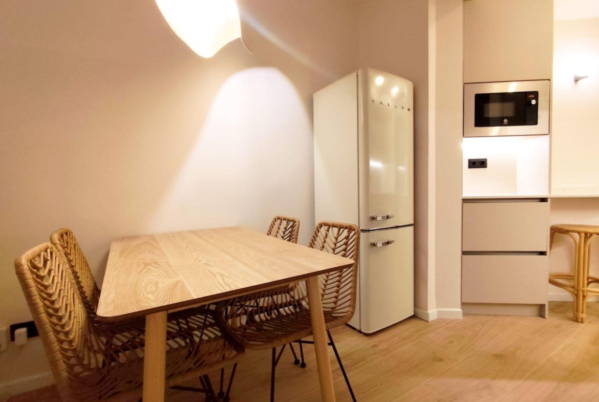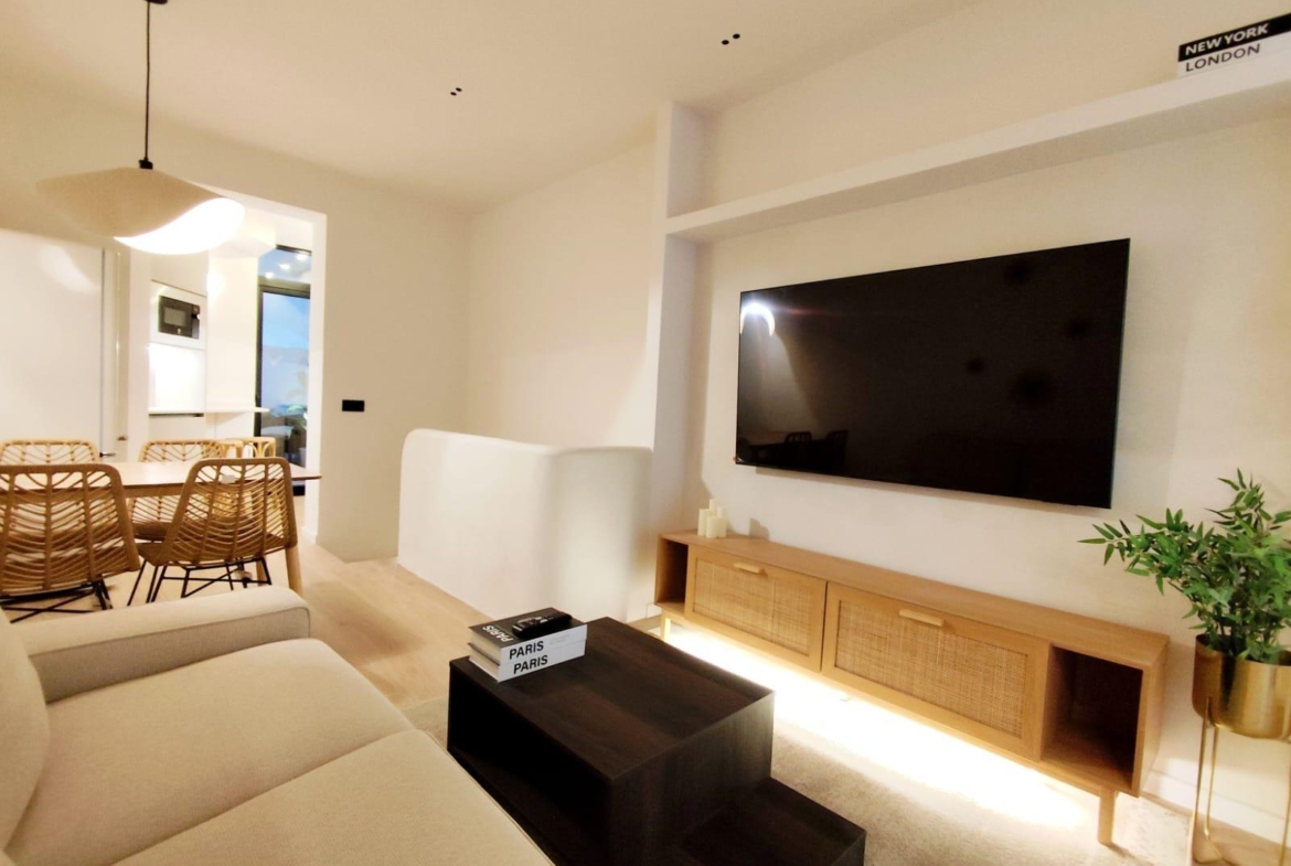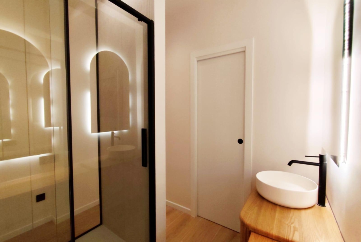 La cocina está completamente equipada con electrodomésticos integrados y mobiliario de diseño, ofreciendo un espacio práctico y preparado para el día a día. Además, el inmueble cuenta con un encantador patio privado, ideal para disfrutar del sol, crear una zona chill-out o incorporar vegetación y decoración exterior.