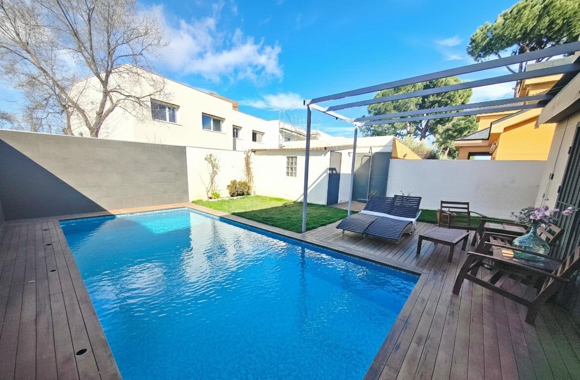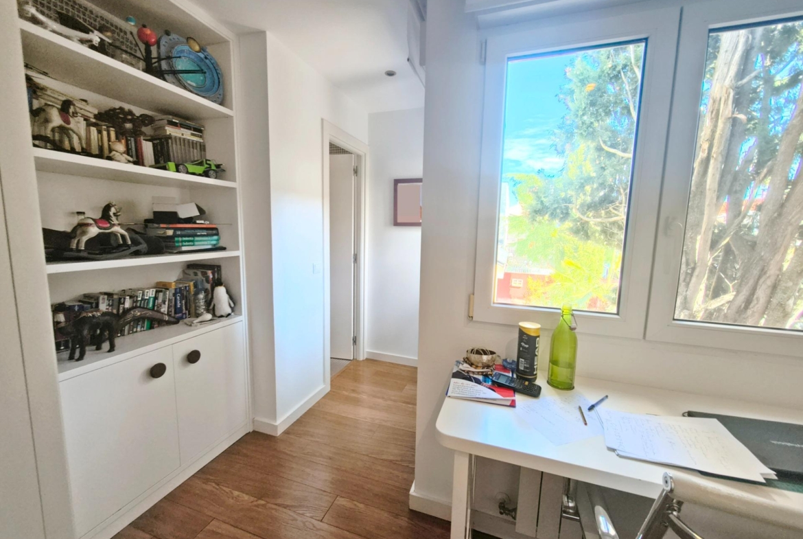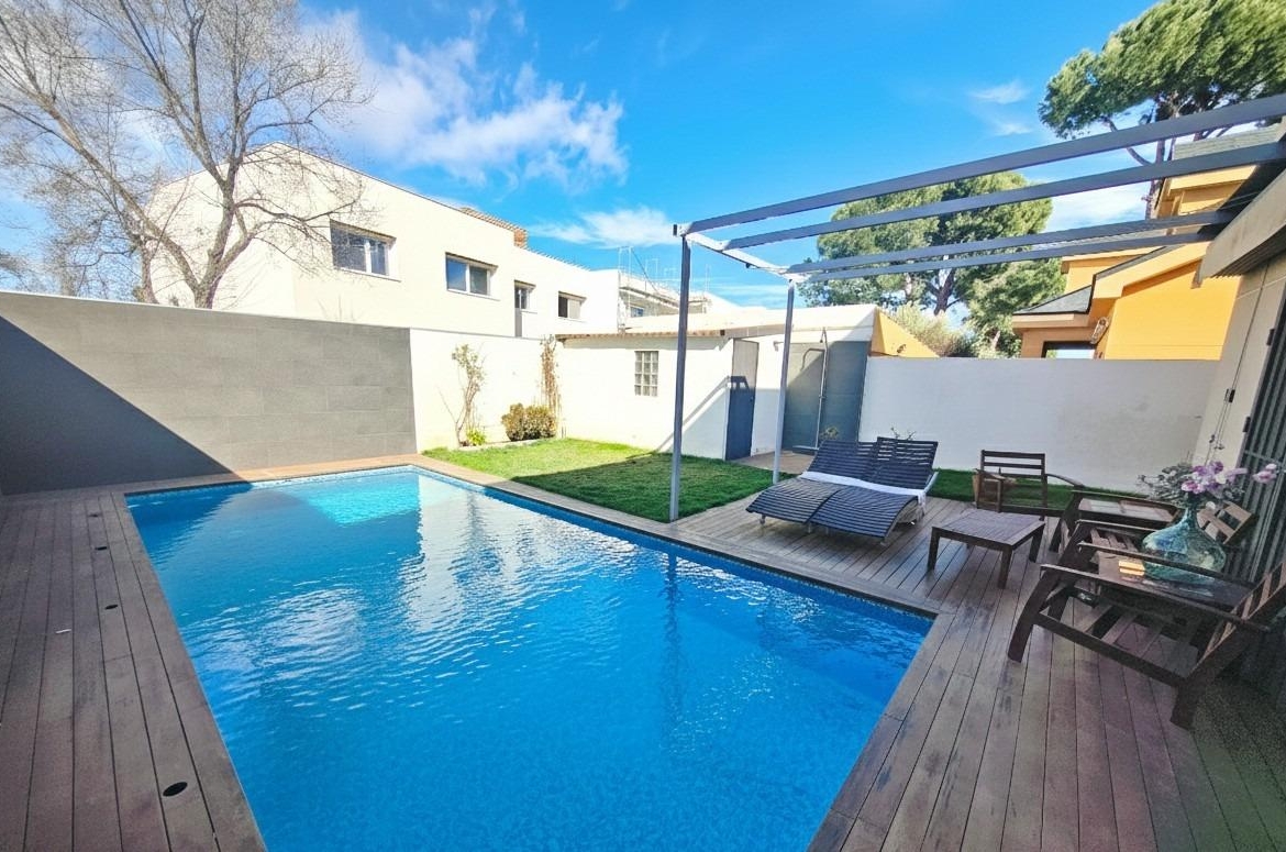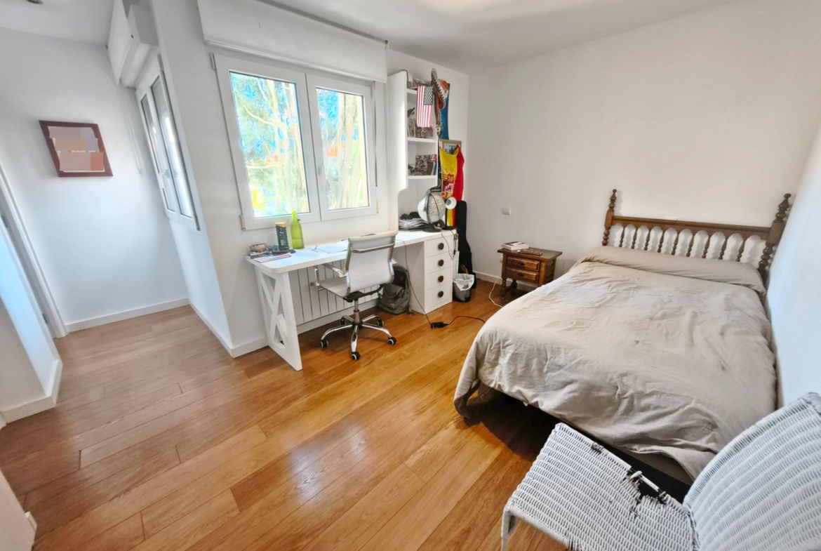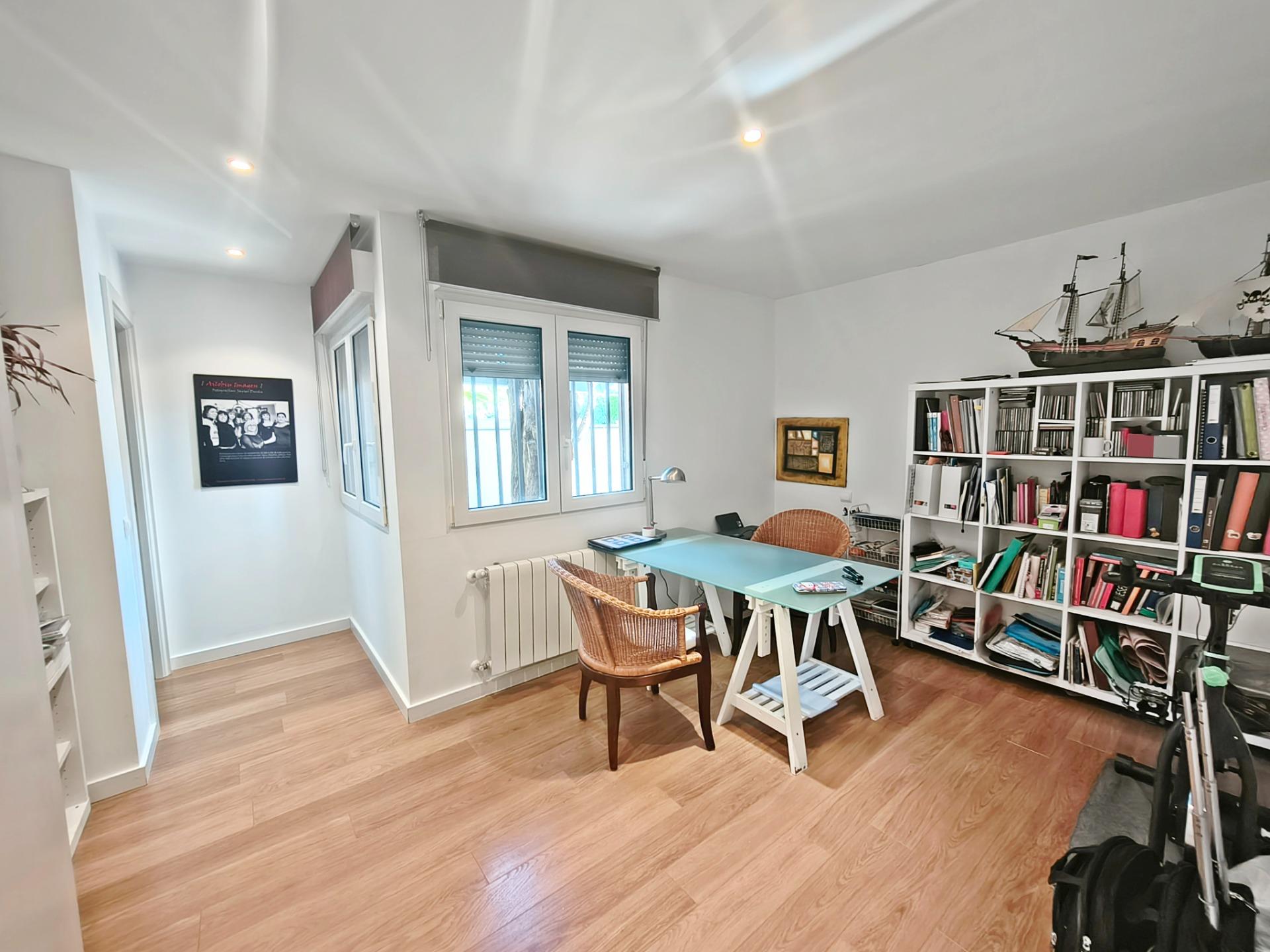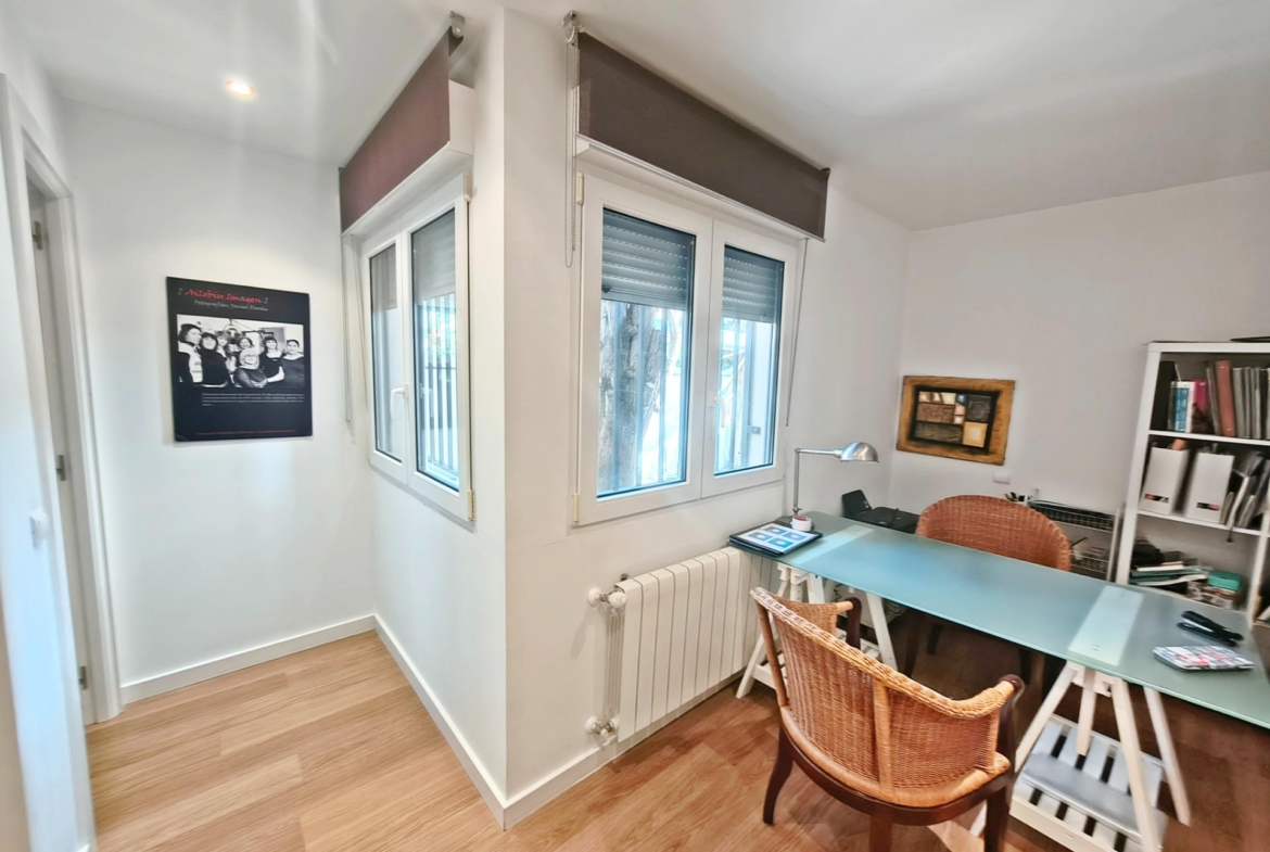 La vivienda tiene 309 m² construidos y 208 m2 de vivienda distribuidos en dos plantas, destacando su luminosidad y la amplitud de sus espacios. Nos recibe un jardín delantero solado antes de entrar al moderno hall, donde los techos altos hacen que el espacio se abra ante nosotros. A la derecha encontramos una habitación convertida actualmente en despacho y que en origen tenía un baño en suite dedicado ahora a cuarto de lavandería y despensa. A continuación, está un aseo de cortesía y la maravillosa cocina con puertas correderas, acceso al jardín a través de un gran ventanal. En esta parte del jardín encontramos la barbacoa de obra, tarima exterior de madera IPE, árboles consolidados y una pérgola donde podremos disfrutar del primer café con el sol de mañana. Llegamos al amplio salón comedor desde el que accedemos al jardín con una piscina de 24m2, zona de césped, pérgola y cuarto de almacenamiento. Una moderna escalera flotante nos conduce a la zona de descanso donde están los tres dormitorios, los cuales cuentan con armarios empotrados y tres baños en suite, el del dormitorio principal con bañera de hidromasaje y luz natural. Destacan los amplios espacios cuadrados de la vivienda sin obstáculos para la vista y perfectamente iluminados tanto por luz natural como por las luces encastradas en el techo.