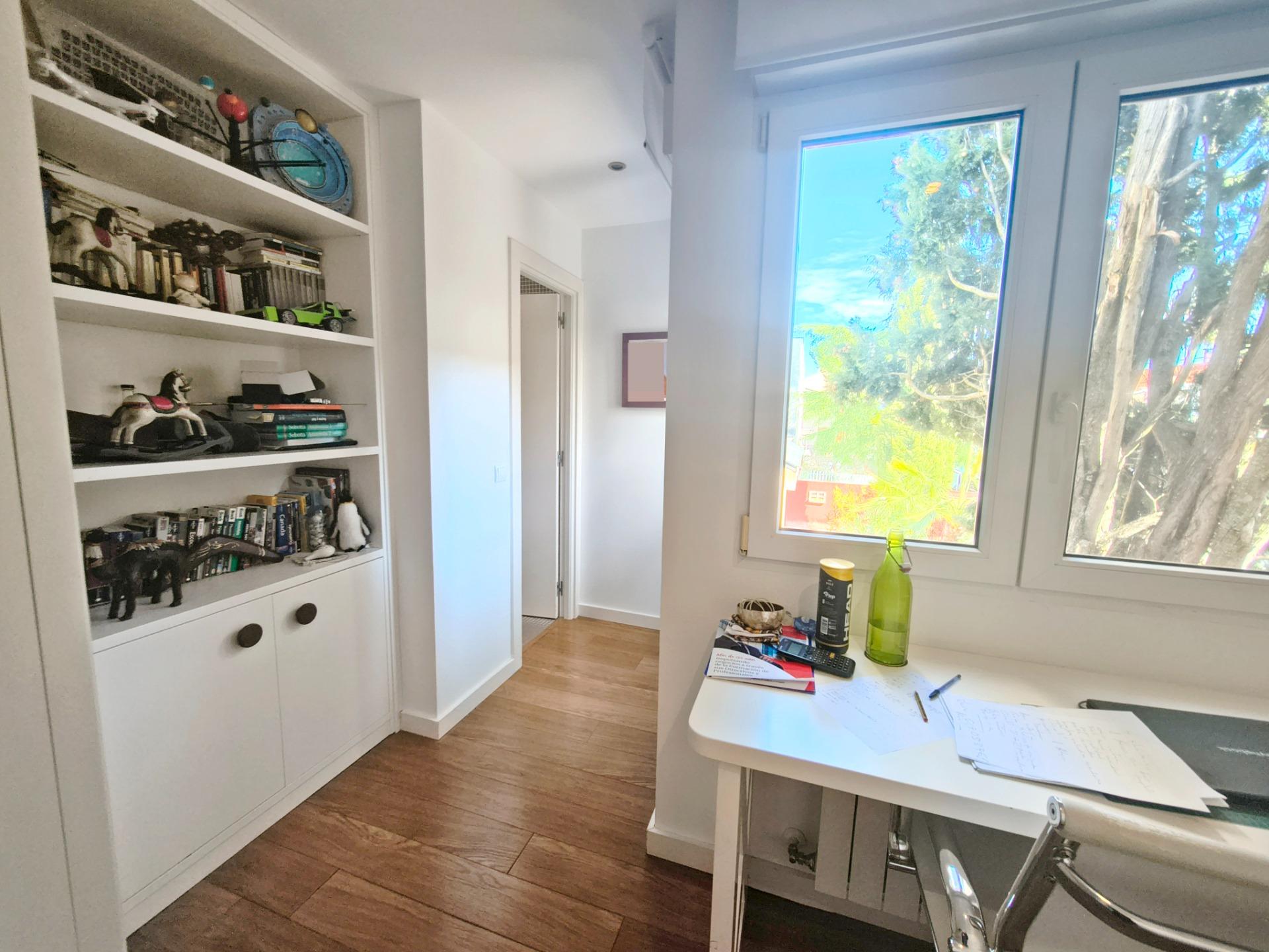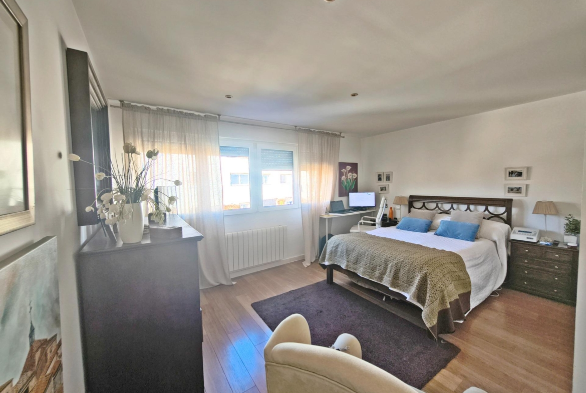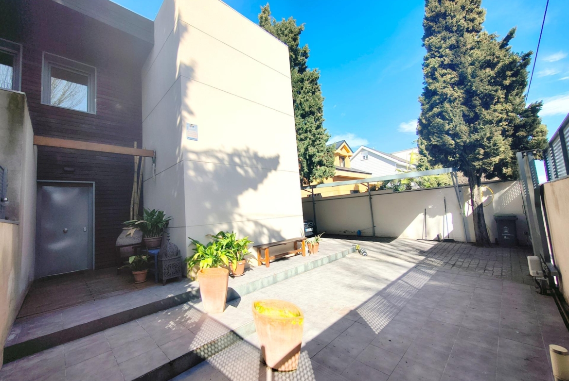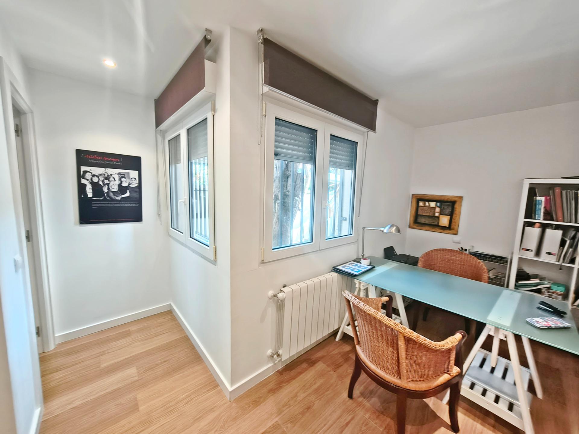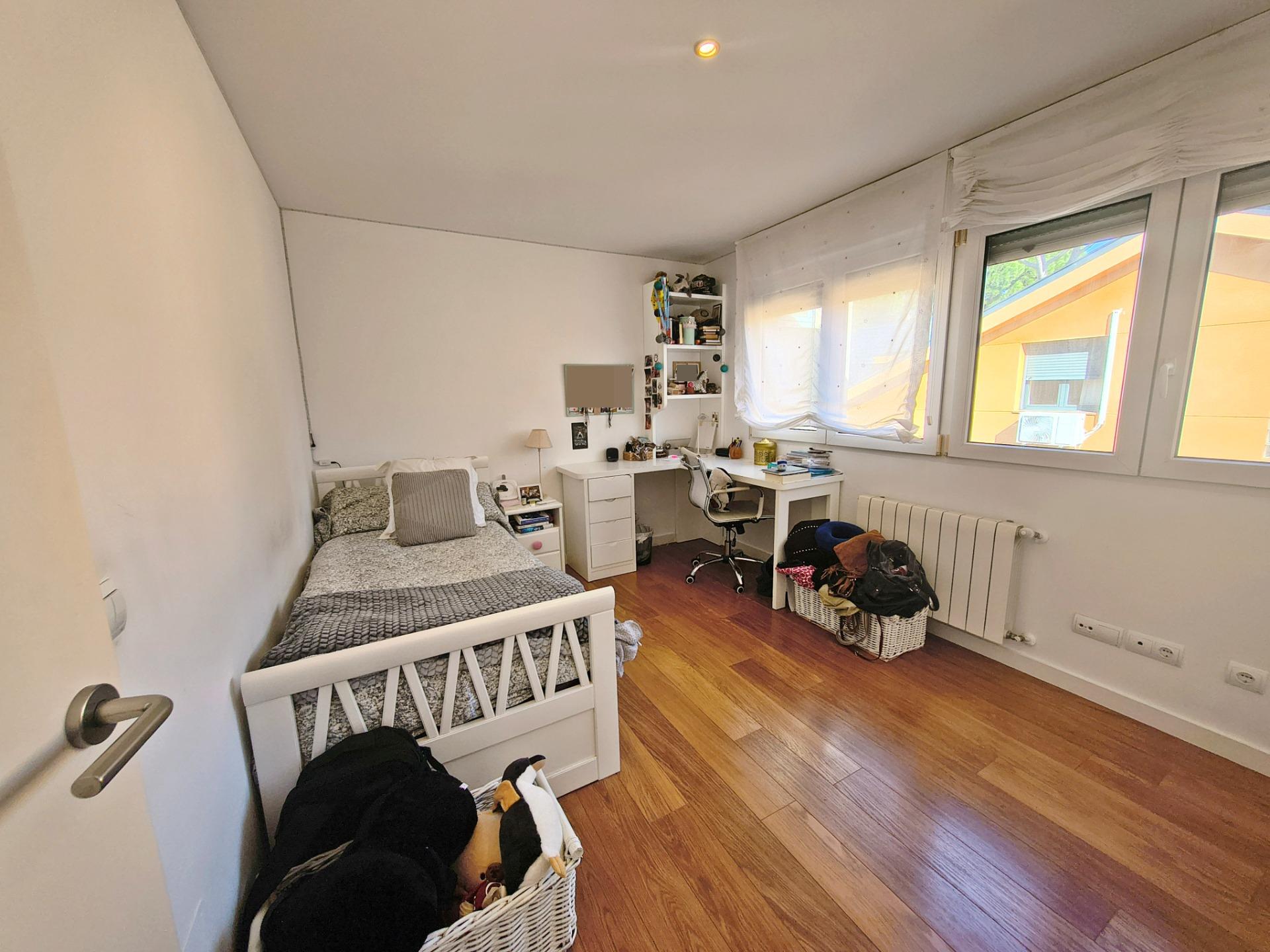 La vivienda tiene 309 m² construidos y 208 m2 de vivienda distribuidos en dos plantas, destacando su luminosidad y la amplitud de sus espacios. Nos recibe un jardín delantero solado antes de entrar al moderno hall, donde los techos altos hacen que el espacio se abra ante nosotros. A la derecha encontramos una habitación convertida actualmente en despacho y que en origen tenía un baño en suite dedicado ahora a cuarto de lavandería y despensa. A continuación, está un aseo de cortesía y la maravillosa cocina con puertas correderas, acceso al jardín a través de un gran ventanal. En esta parte del jardín encontramos la barbacoa de obra, tarima exterior de madera IPE, árboles consolidados y una pérgola donde podremos disfrutar del primer café con el sol de mañana. Llegamos al amplio salón comedor desde el que accedemos al jardín con una piscina de 24m2, zona de césped, pérgola y cuarto de almacenamiento. Una moderna escalera flotante nos conduce a la zona de descanso donde están los tres dormitorios, los cuales cuentan con armarios empotrados y tres baños en suite, el del dormitorio principal con bañera de hidromasaje y luz natural. Destacan los amplios espacios cuadrados de la vivienda sin obstáculos para la vista y perfectamente iluminados tanto por luz natural como por las luces encastradas en el techo.