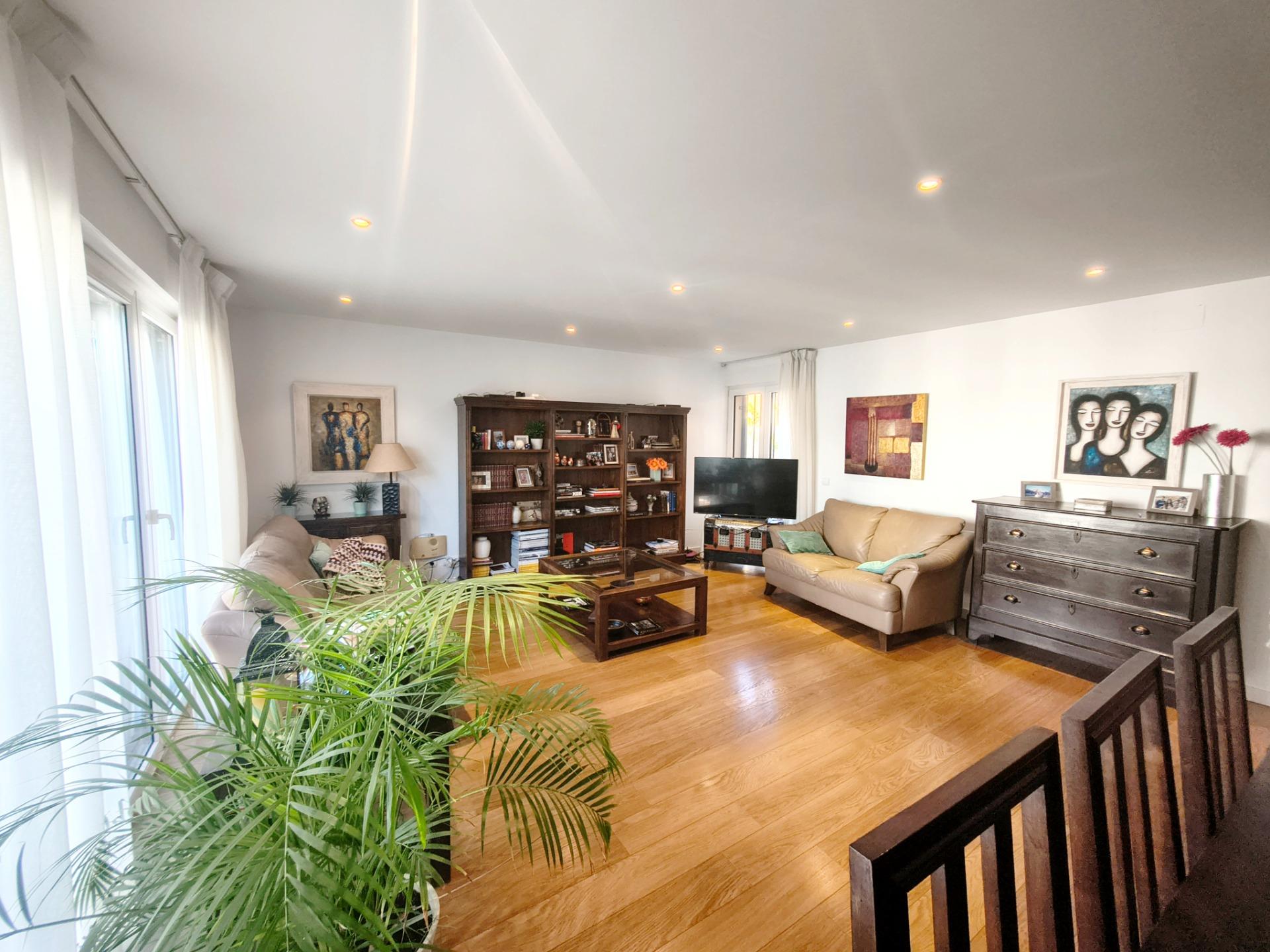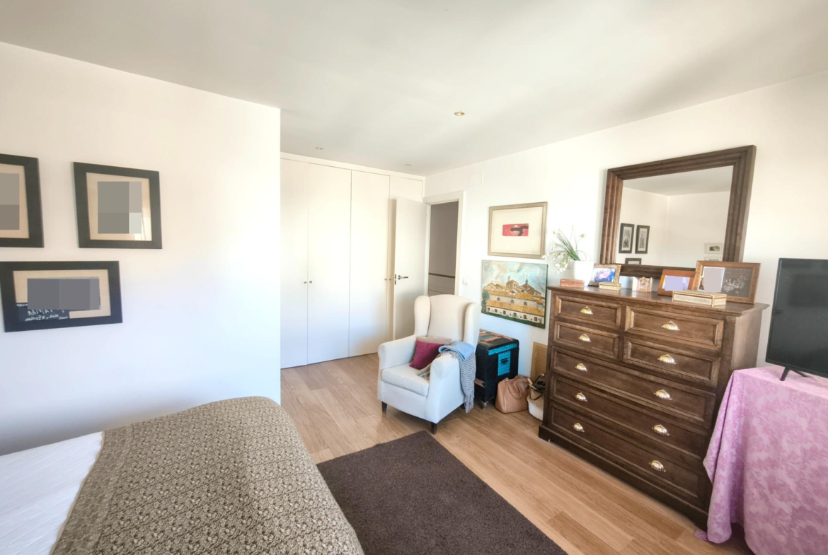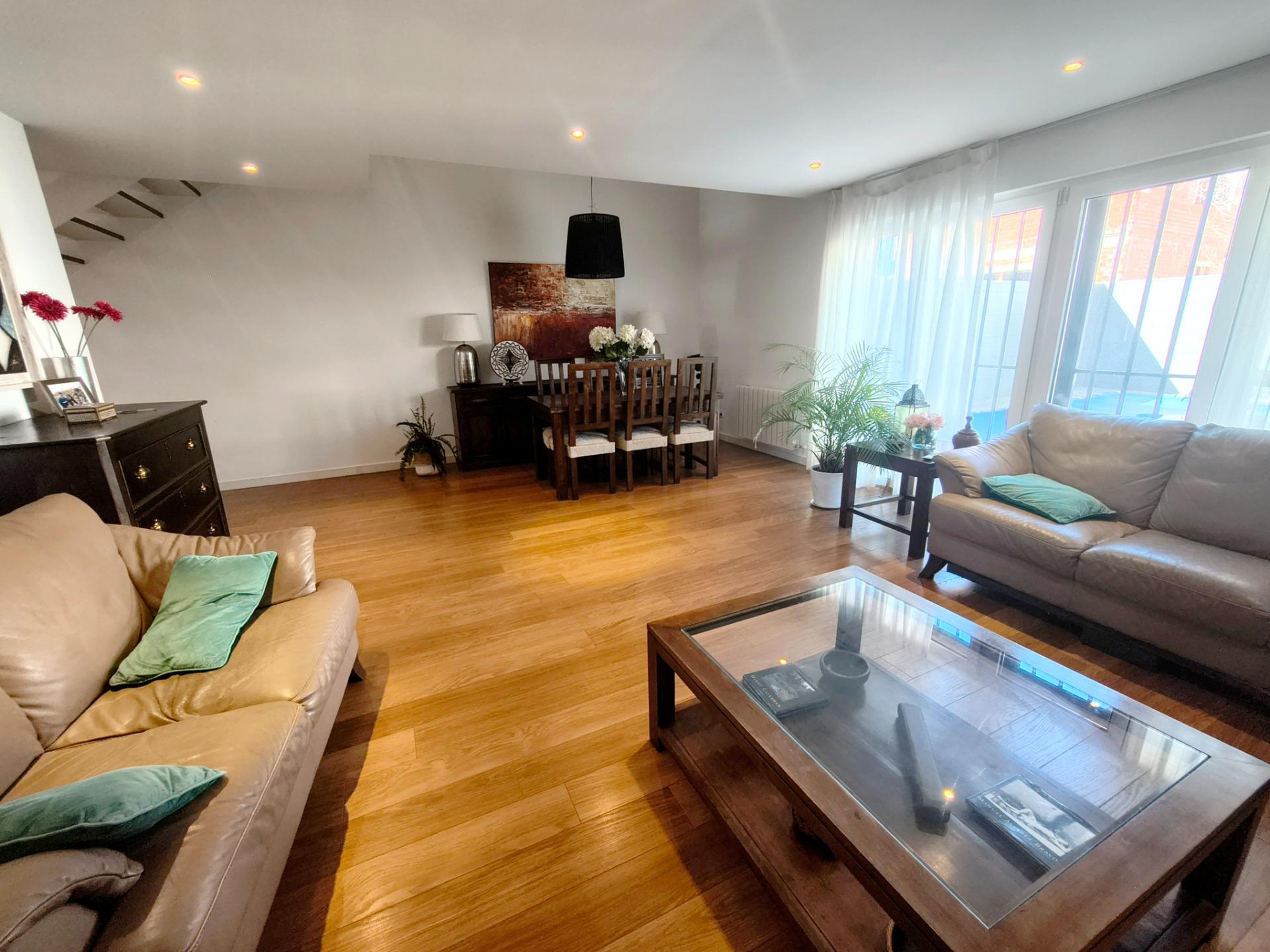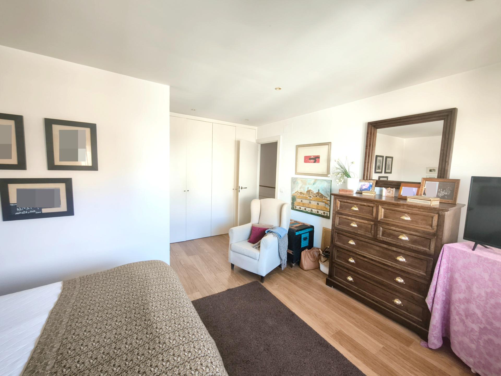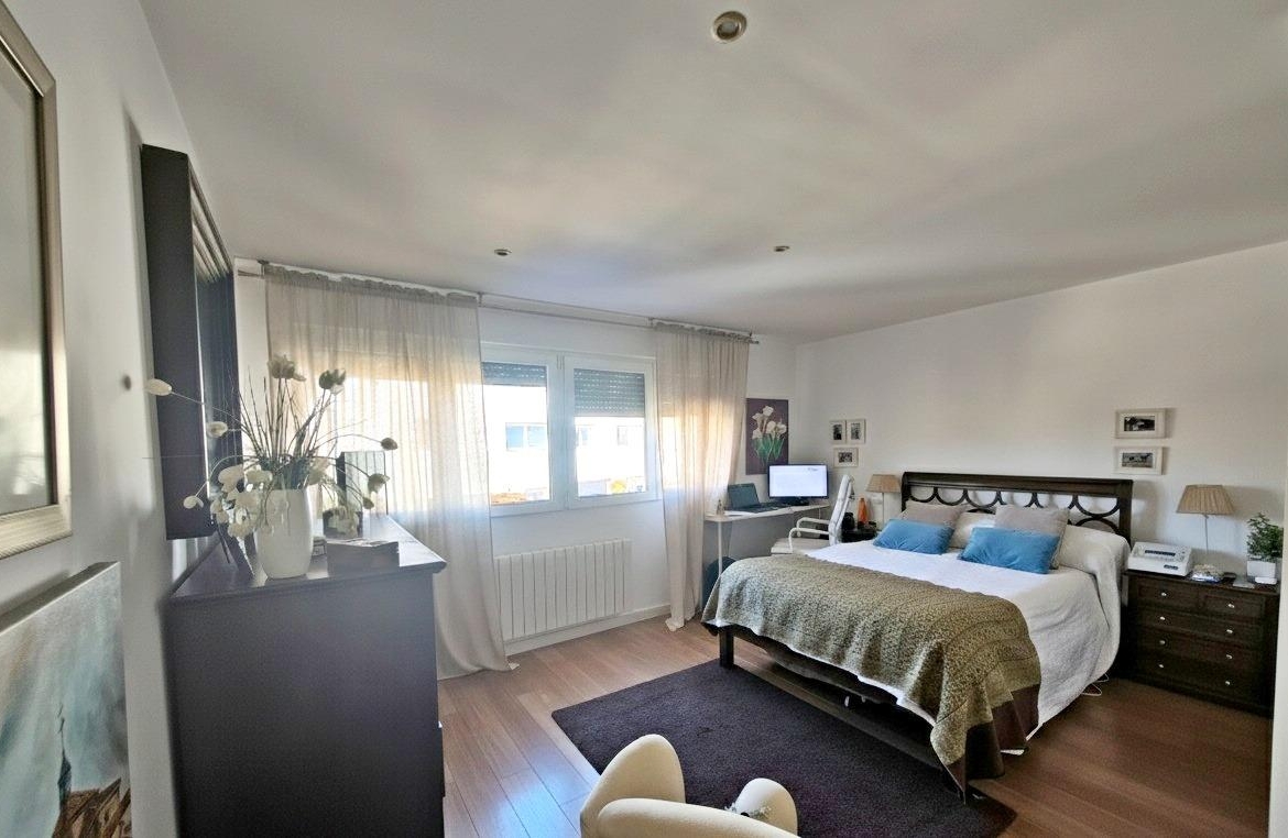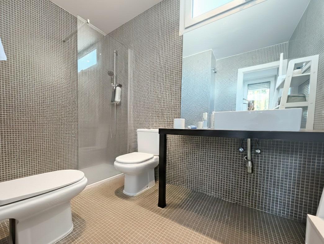 La vivienda tiene 309 m² construidos y 208 m2 de vivienda distribuidos en dos plantas, destacando su luminosidad y la amplitud de sus espacios. Nos recibe un jardín delantero solado antes de entrar al moderno hall, donde los techos altos hacen que el espacio se abra ante nosotros. A la derecha encontramos una habitación convertida actualmente en despacho y que en origen tenía un baño en suite dedicado ahora a cuarto de lavandería y despensa. A continuación, está un aseo de cortesía y la maravillosa cocina con puertas correderas, acceso al jardín a través de un gran ventanal. En esta parte del jardín encontramos la barbacoa de obra, tarima exterior de madera IPE, árboles consolidados y una pérgola donde podremos disfrutar del primer café con el sol de mañana. Llegamos al amplio salón comedor desde el que accedemos al jardín con una piscina de 24m2, zona de césped, pérgola y cuarto de almacenamiento. Una moderna escalera flotante nos conduce a la zona de descanso donde están los tres dormitorios, los cuales cuentan con armarios empotrados y tres baños en suite, el del dormitorio principal con bañera de hidromasaje y luz natural. Destacan los amplios espacios cuadrados de la vivienda sin obstáculos para la vista y perfectamente iluminados tanto por luz natural como por las luces encastradas en el techo.