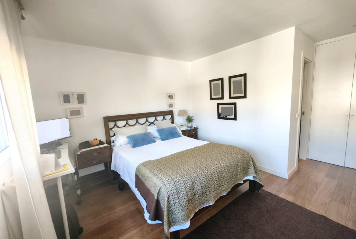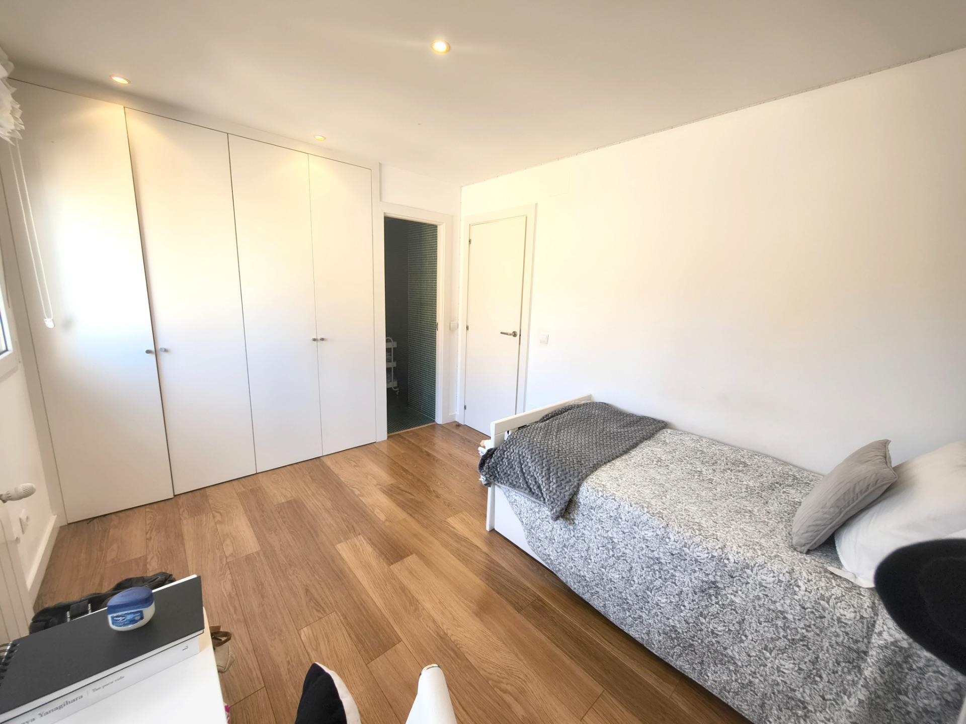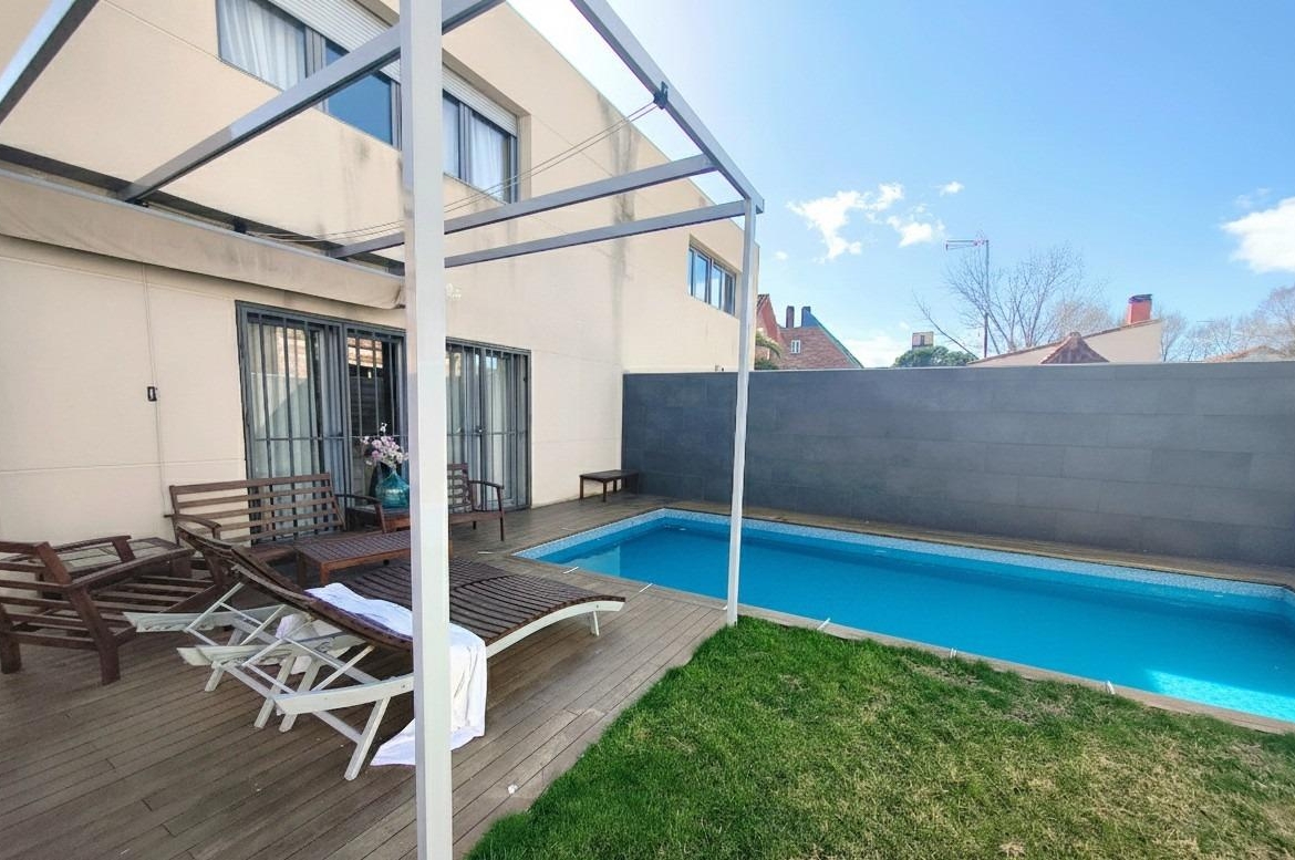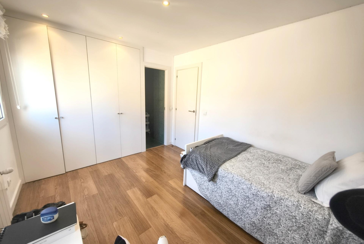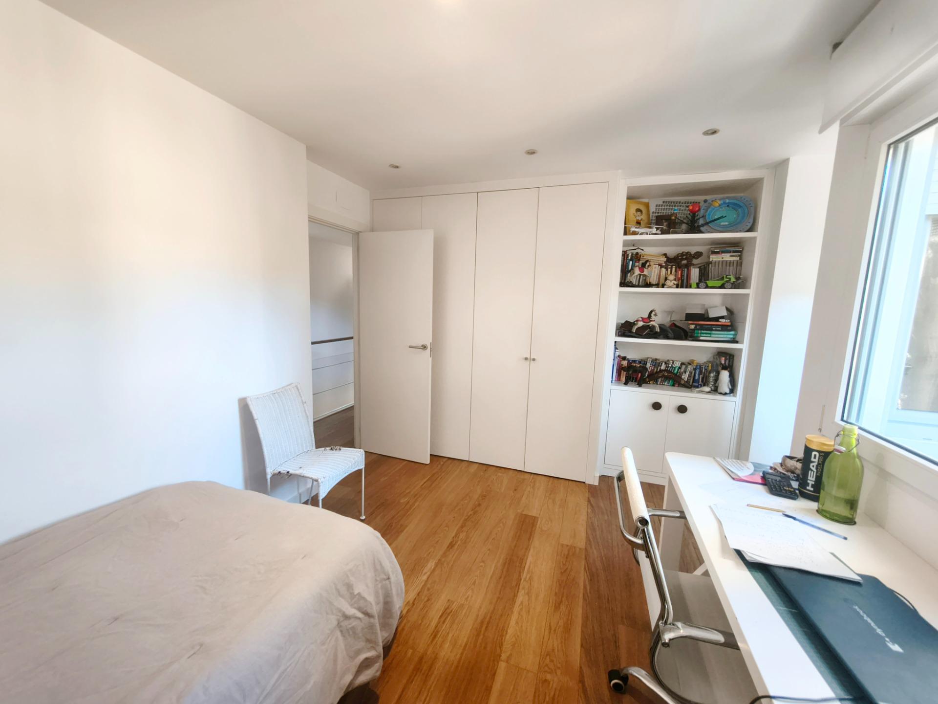 La vivienda tiene 309 m² construidos y 208 m2 de vivienda distribuidos en dos plantas, destacando su luminosidad y la amplitud de sus espacios. Nos recibe un jardín delantero solado antes de entrar al moderno hall, donde los techos altos hacen que el espacio se abra ante nosotros. A la derecha encontramos una habitación convertida actualmente en despacho y que en origen tenía un baño en suite dedicado ahora a cuarto de lavandería y despensa. A continuación, está un aseo de cortesía y la maravillosa cocina con puertas correderas, acceso al jardín a través de un gran ventanal. En esta parte del jardín encontramos la barbacoa de obra, tarima exterior de madera IPE, árboles consolidados y una pérgola donde podremos disfrutar del primer café con el sol de mañana. Llegamos al amplio salón comedor desde el que accedemos al jardín con una piscina de 24m2, zona de césped, pérgola y cuarto de almacenamiento. Una moderna escalera flotante nos conduce a la zona de descanso donde están los tres dormitorios, los cuales cuentan con armarios empotrados y tres baños en suite, el del dormitorio principal con bañera de hidromasaje y luz natural. Destacan los amplios espacios cuadrados de la vivienda sin obstáculos para la vista y perfectamente iluminados tanto por luz natural como por las luces encastradas en el techo.