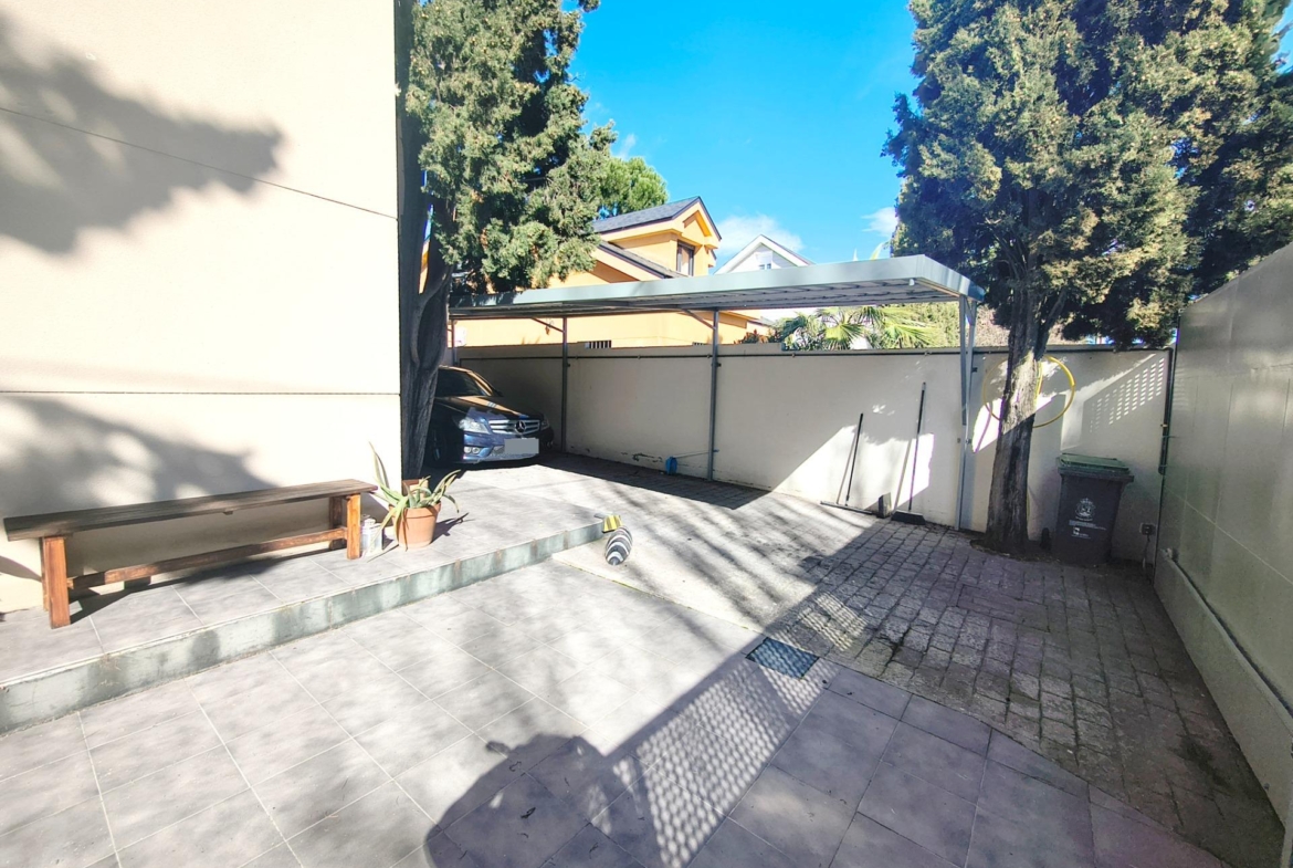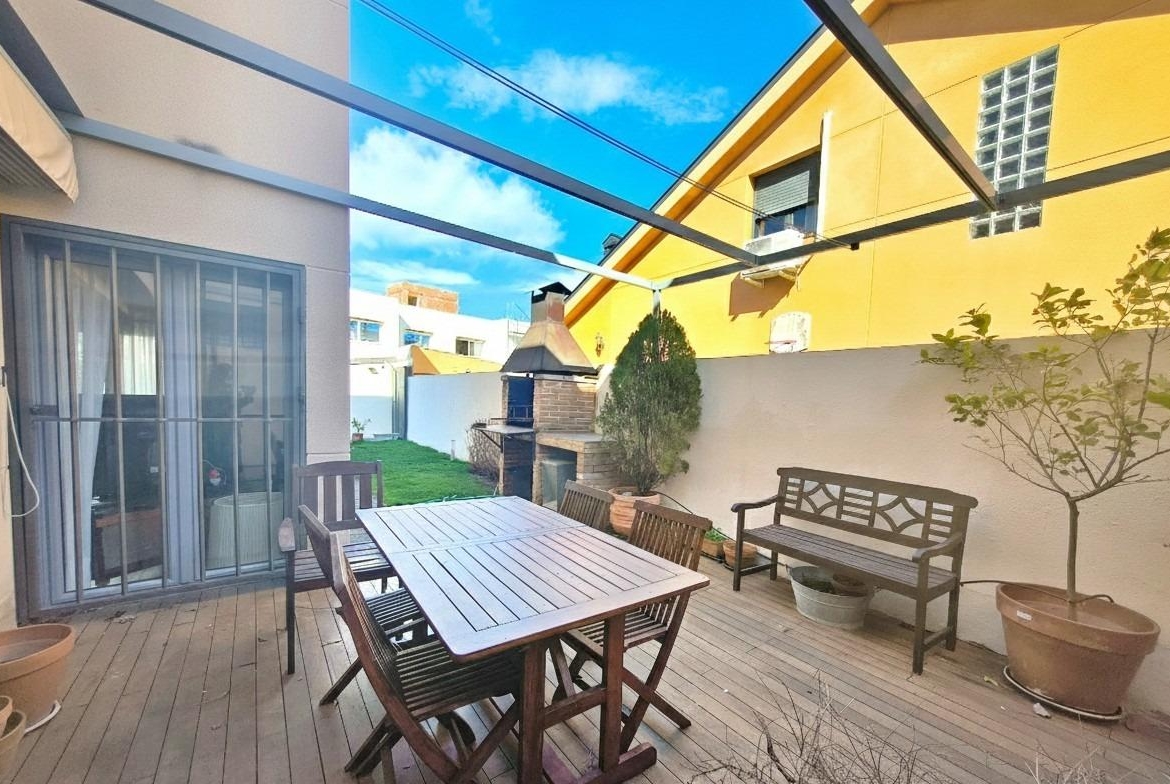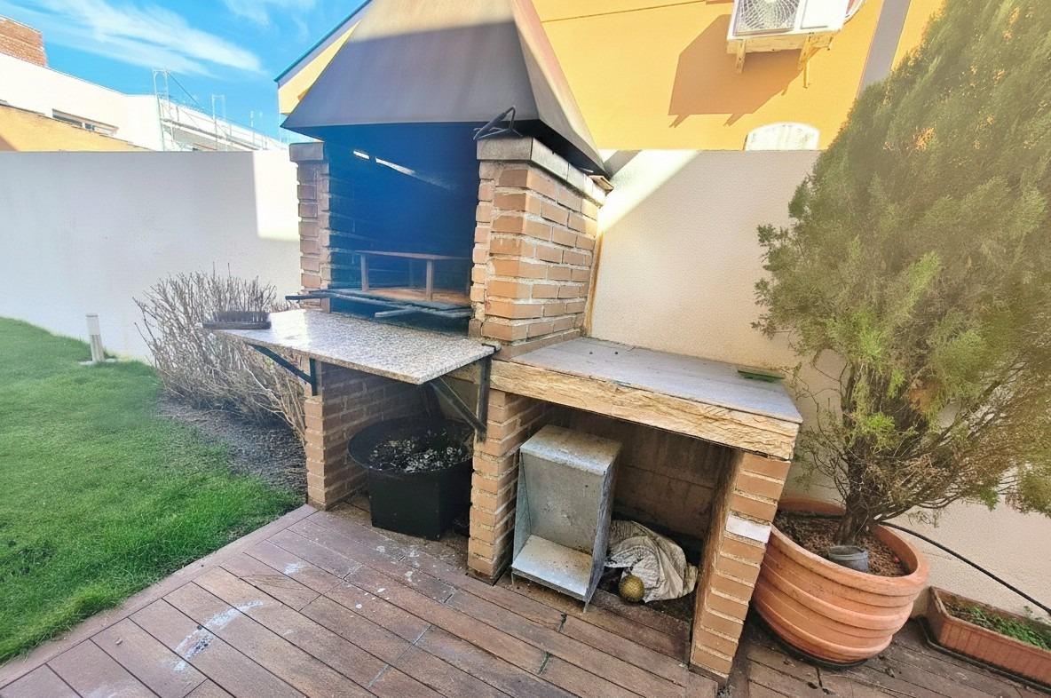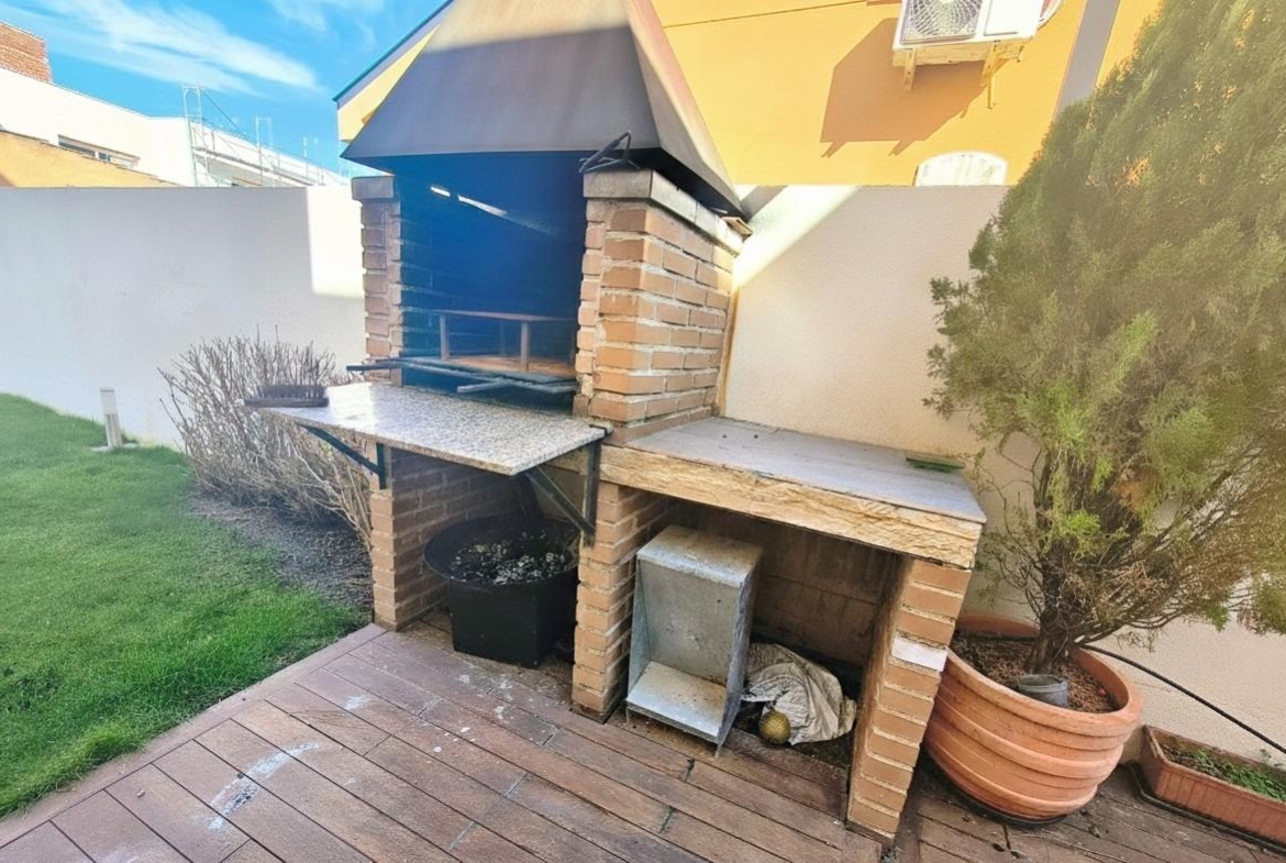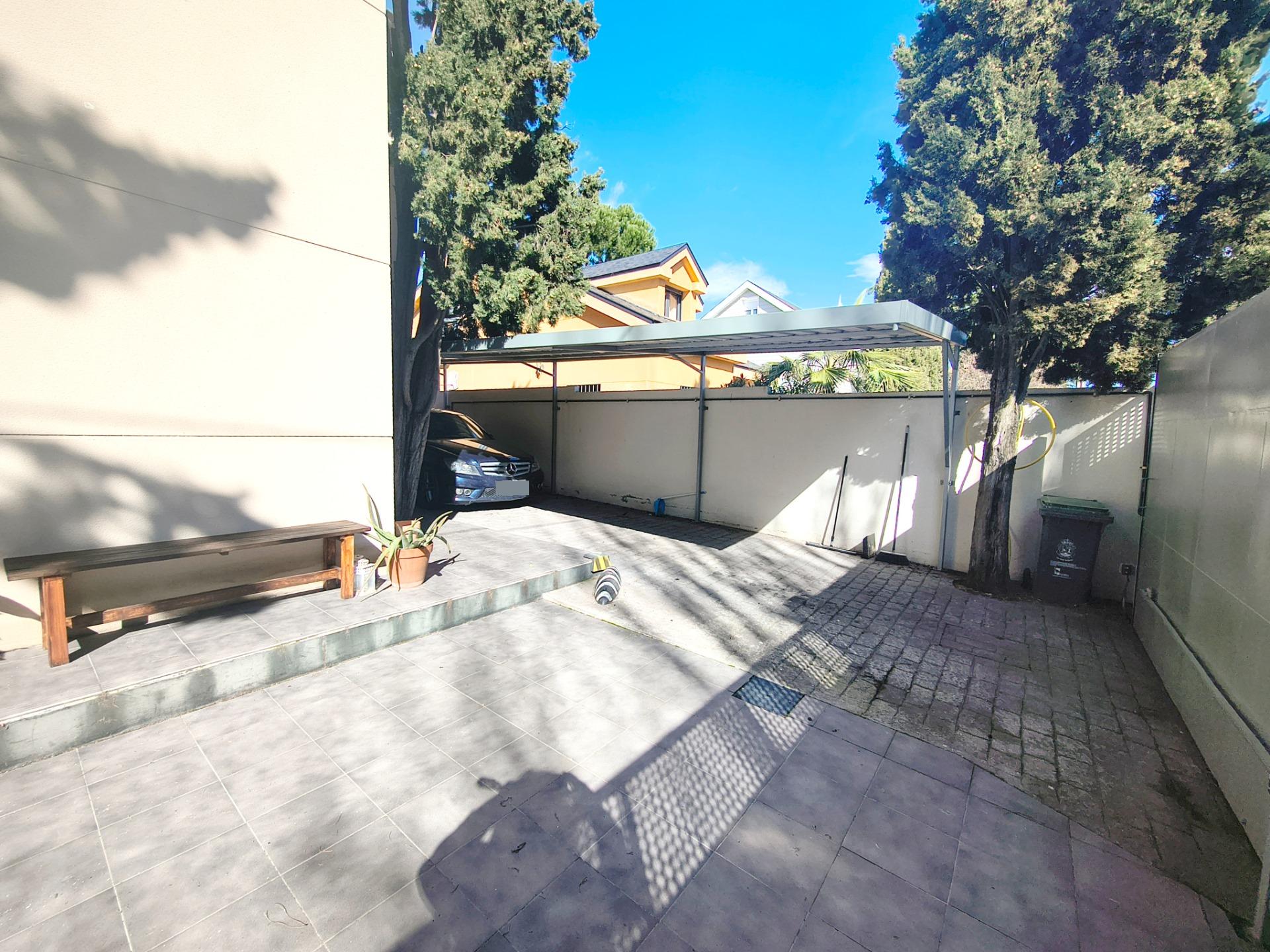 El jardín rodea la casa creando cuatro zonas, enfrente de la casa está la zona de acceso para peatones y con portón automático para coches, teniendo espacio cubierto para dos vehículos. Luego tenemos la zona de barbacoa y la zona de piscina y relax.