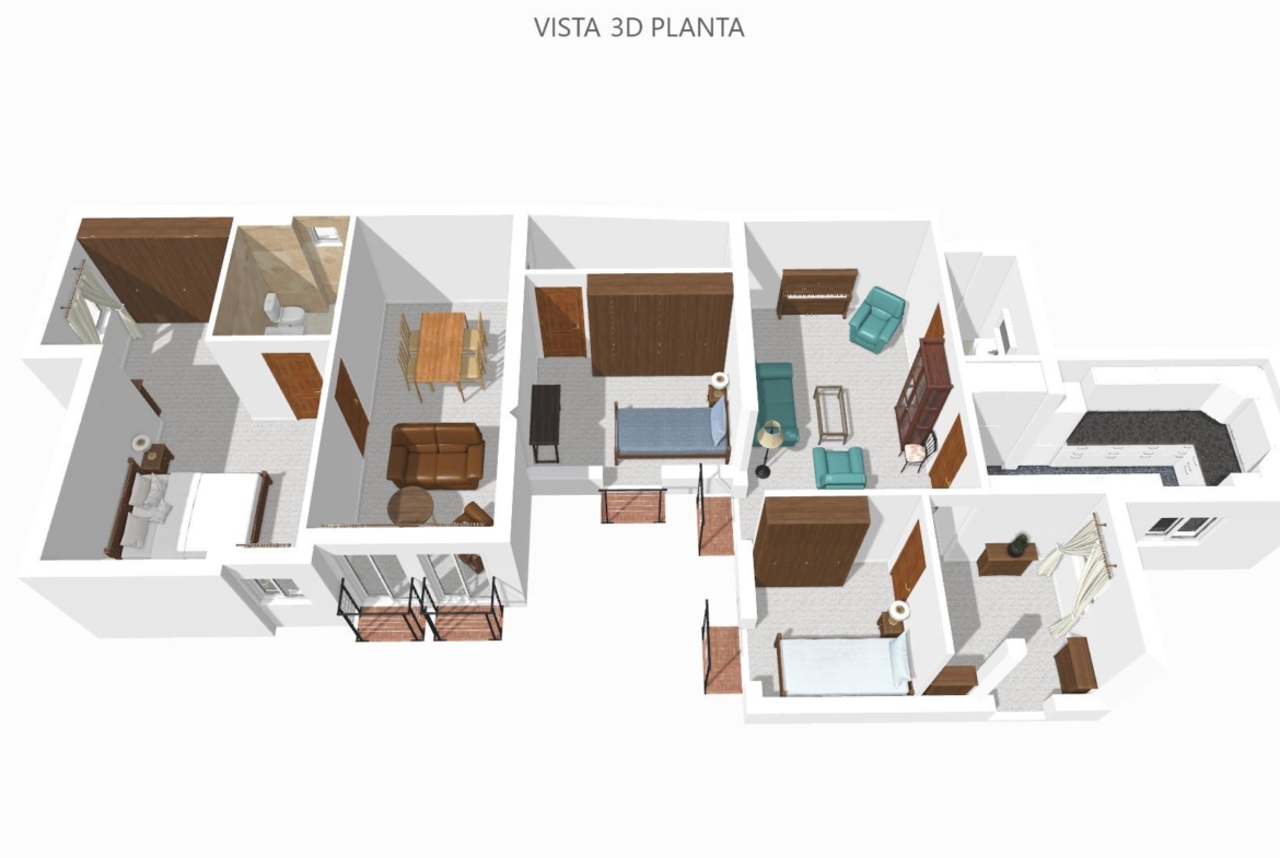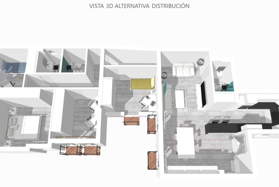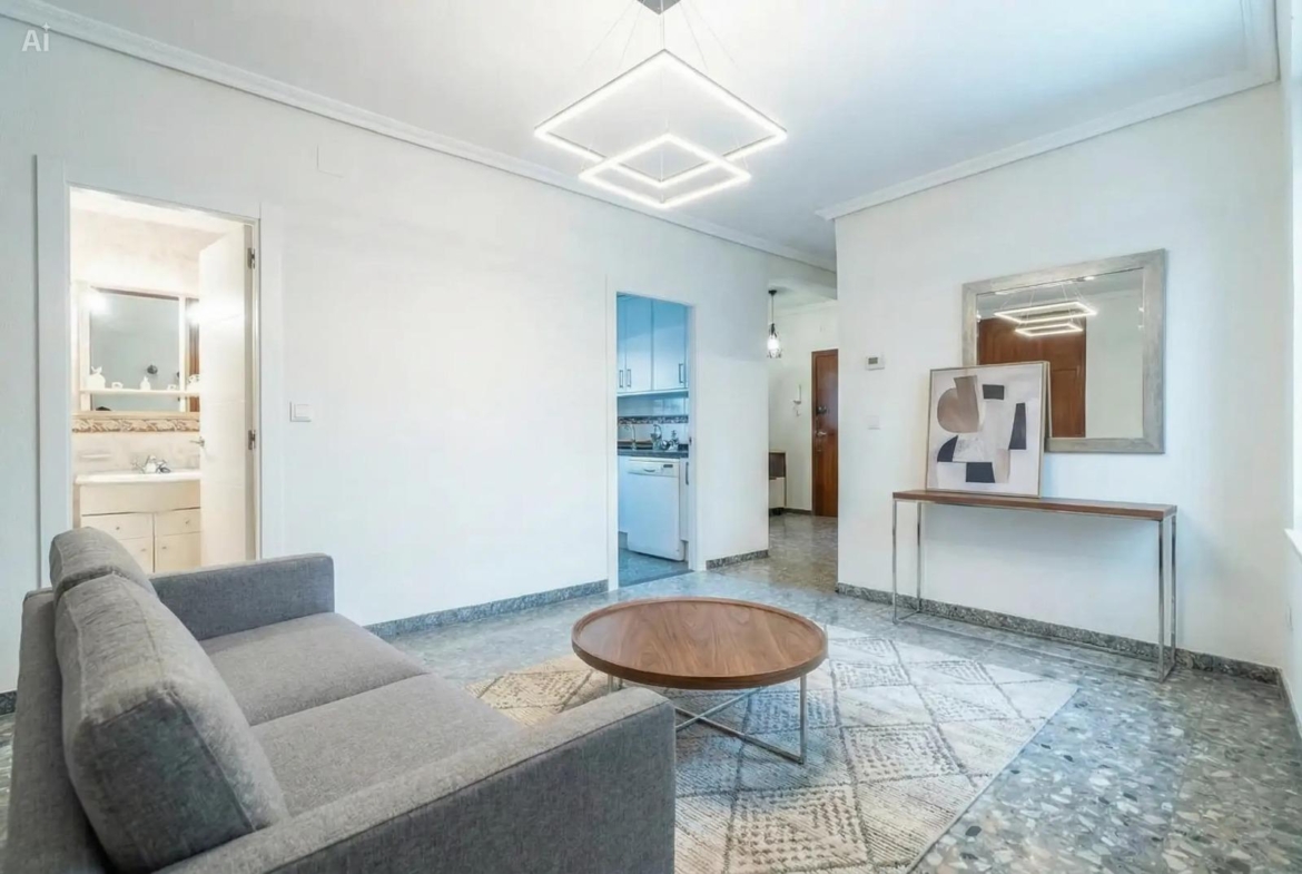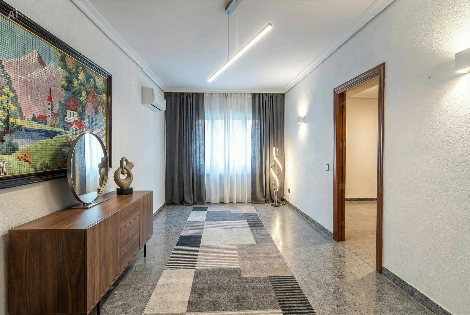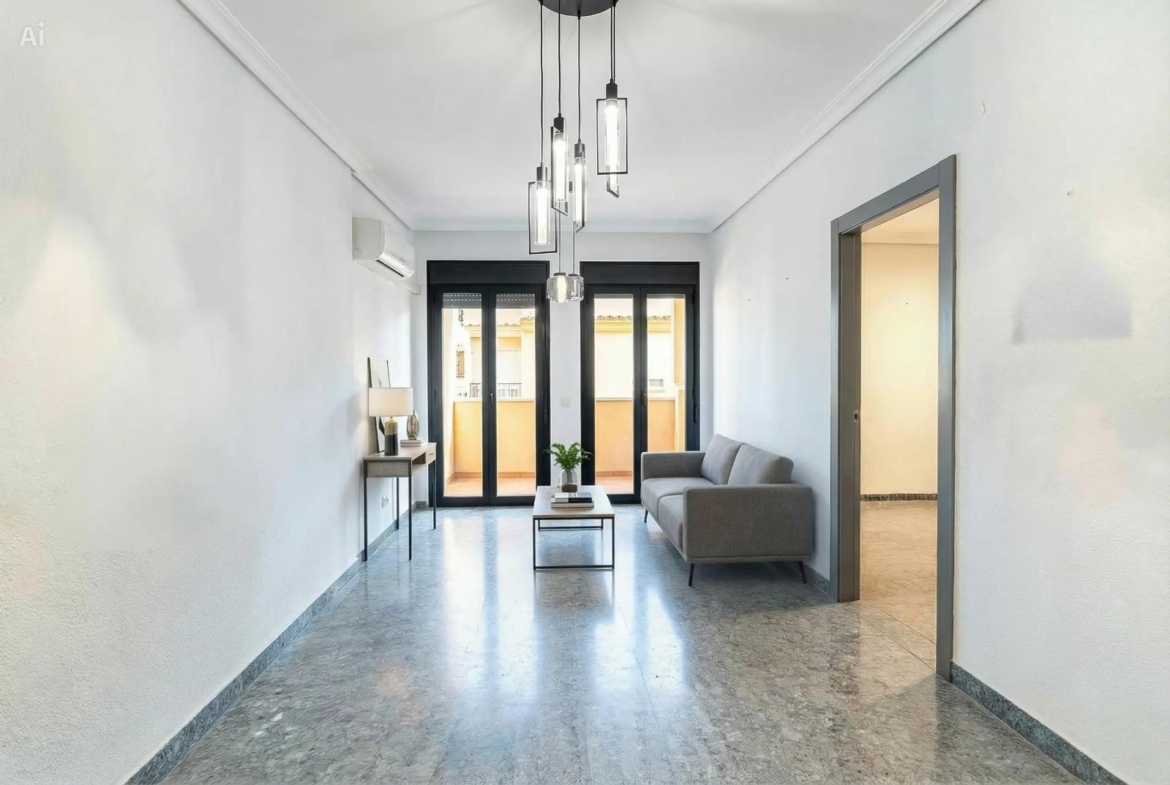 La vivienda consta de 106 metros construidos distribuidos en las siguientes estancias: 2 salones, 1 cocina independiente, 3 dormitorios de los cuales uno de ellos es doble con vestidor y 2 cuartos de baño completos, uno de ellos tipo suite. Todos los dormitorios cuentan con un balcón, lo que proporciona luminosidad a las estancias. Las fotografías que se muestran están realizadas con IA siendo una simulación de la vivienda totalmente reformada.