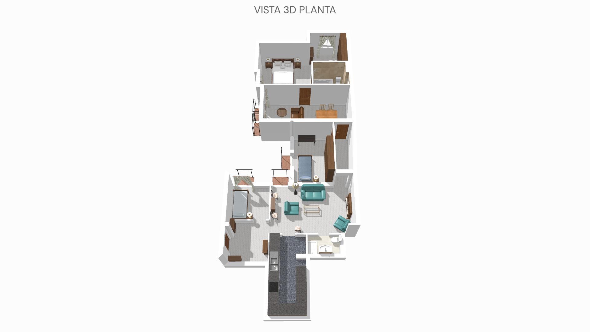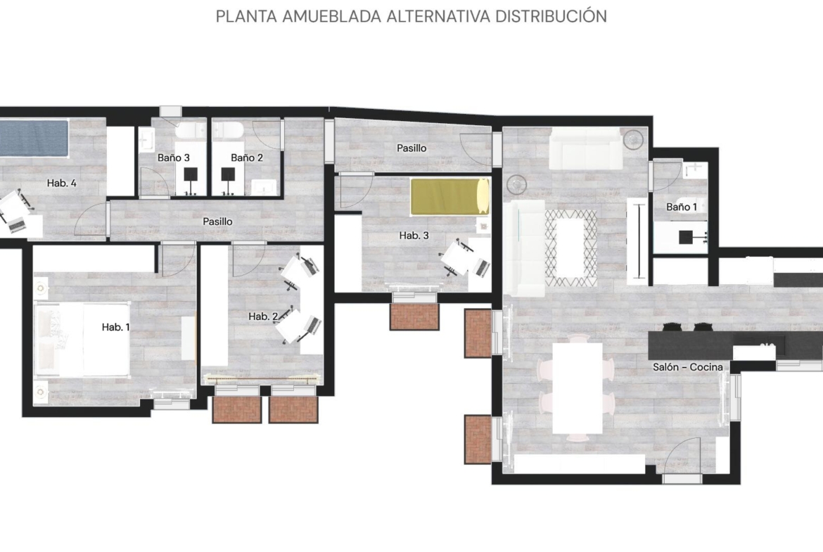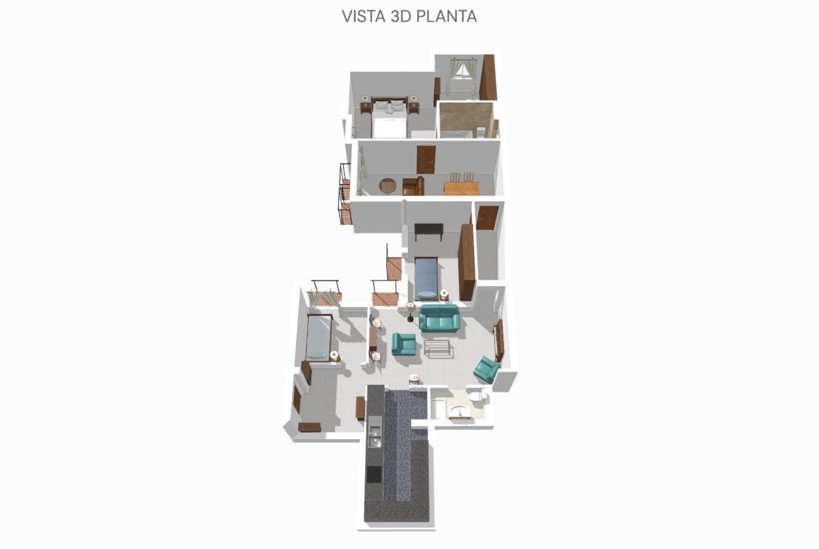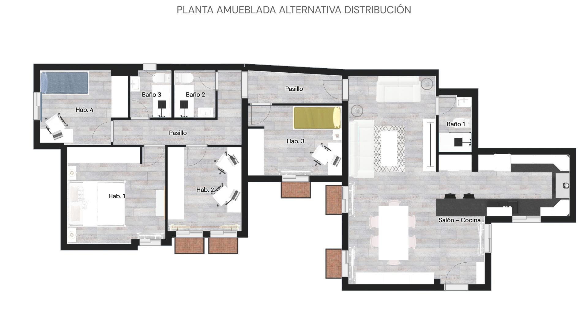 La vivienda consta de 106 metros construidos distribuidos en las siguientes estancias: 2 salones, 1 cocina independiente, 3 dormitorios de los cuales uno de ellos es doble con vestidor y 2 cuartos de baño completos, uno de ellos tipo suite. Todos los dormitorios cuentan con un balcón, lo que proporciona luminosidad a las estancias. Las fotografías que se muestran están realizadas con IA siendo una simulación de la vivienda totalmente reformada.