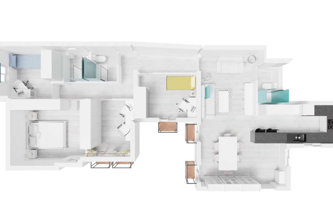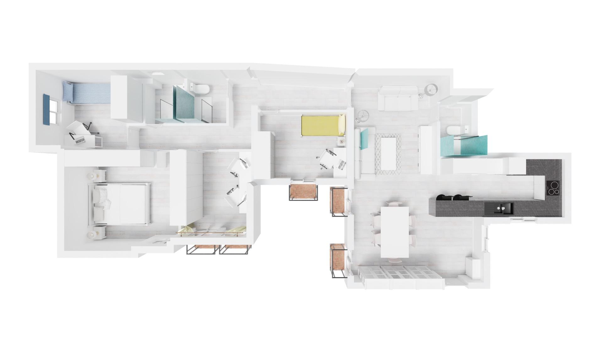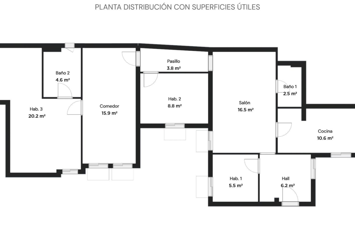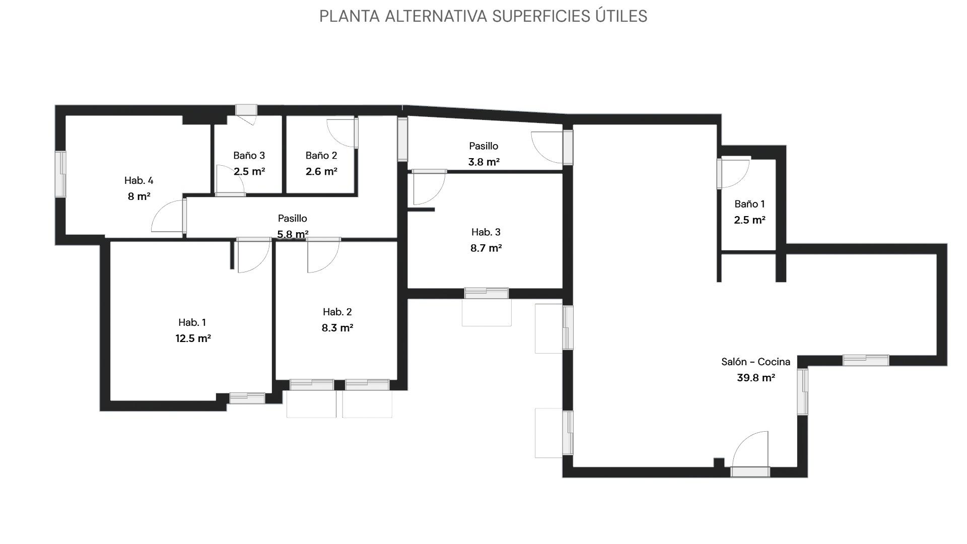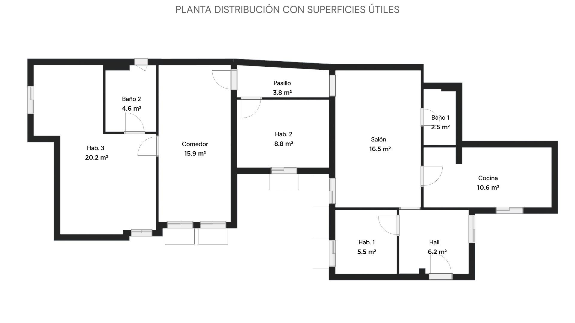 La vivienda consta de 106 metros construidos distribuidos en las siguientes estancias: 2 salones, 1 cocina independiente, 3 dormitorios de los cuales uno de ellos es doble con vestidor y 2 cuartos de baño completos, uno de ellos tipo suite. Todos los dormitorios cuentan con un balcón, lo que proporciona luminosidad a las estancias. Las fotografías que se muestran están realizadas con IA siendo una simulación de la vivienda totalmente reformada.