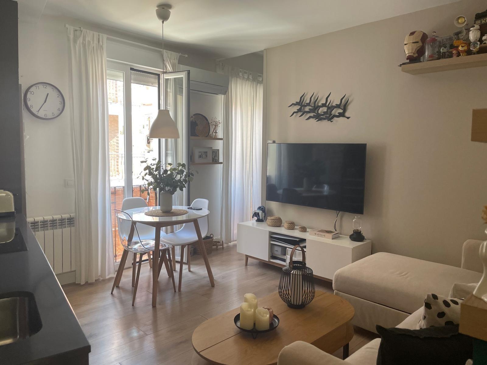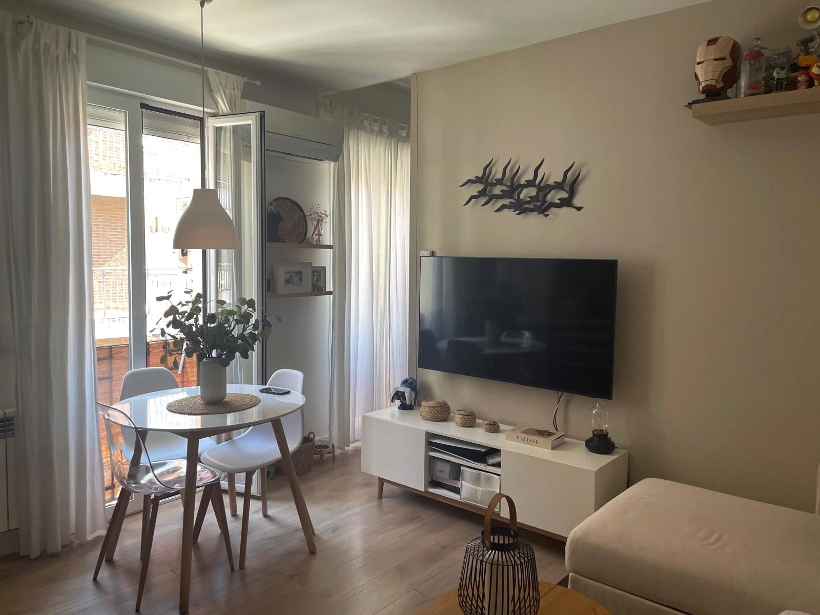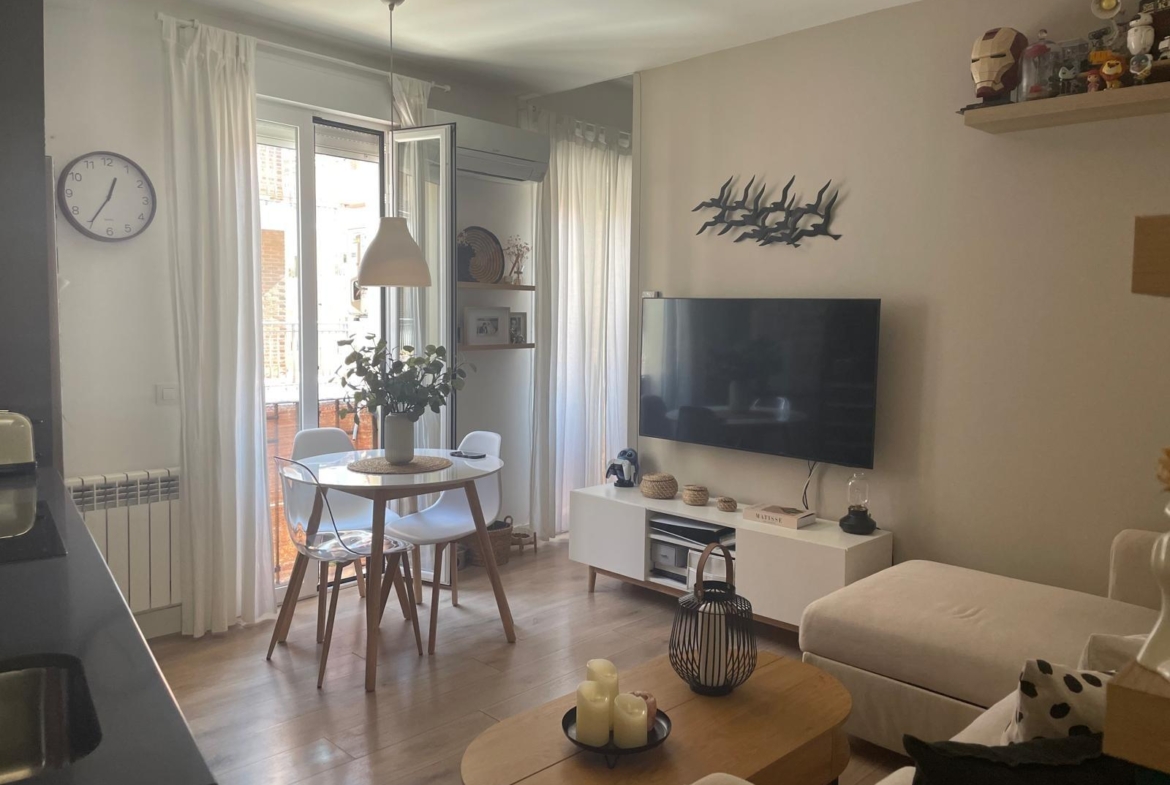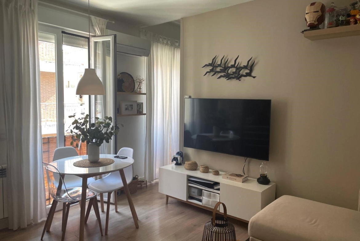 inmobiliarias Encuentro gestiona la venta en exclusiva de apartamento reformado, próximo a la calle Príncipe de Vergara y su auditorio y a pocos minutos andando del parque de Berlín. Piso de 2 dormitorios y 2 baños uno de ellos en SUITE , cocina integrada en el salón amueblada y equipada, zona de armarios con alacena, productos de limpieza y lavadora. Muy luminoso gracias a sus tres miradores a la calle y en su zona interior por ser la última planta, aunque no tiene ascensor, su escalera es amplia y cómoda. En cuanto a sus calidades de reforma, Suelos de tarima en toda la casa, salvo en los baños que son cerámicos, Carpintería interior Blanca y exterior de aluminio con Climalit , split de aire acondicionado y armarios empotrados.