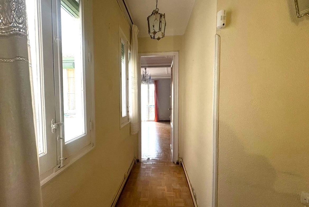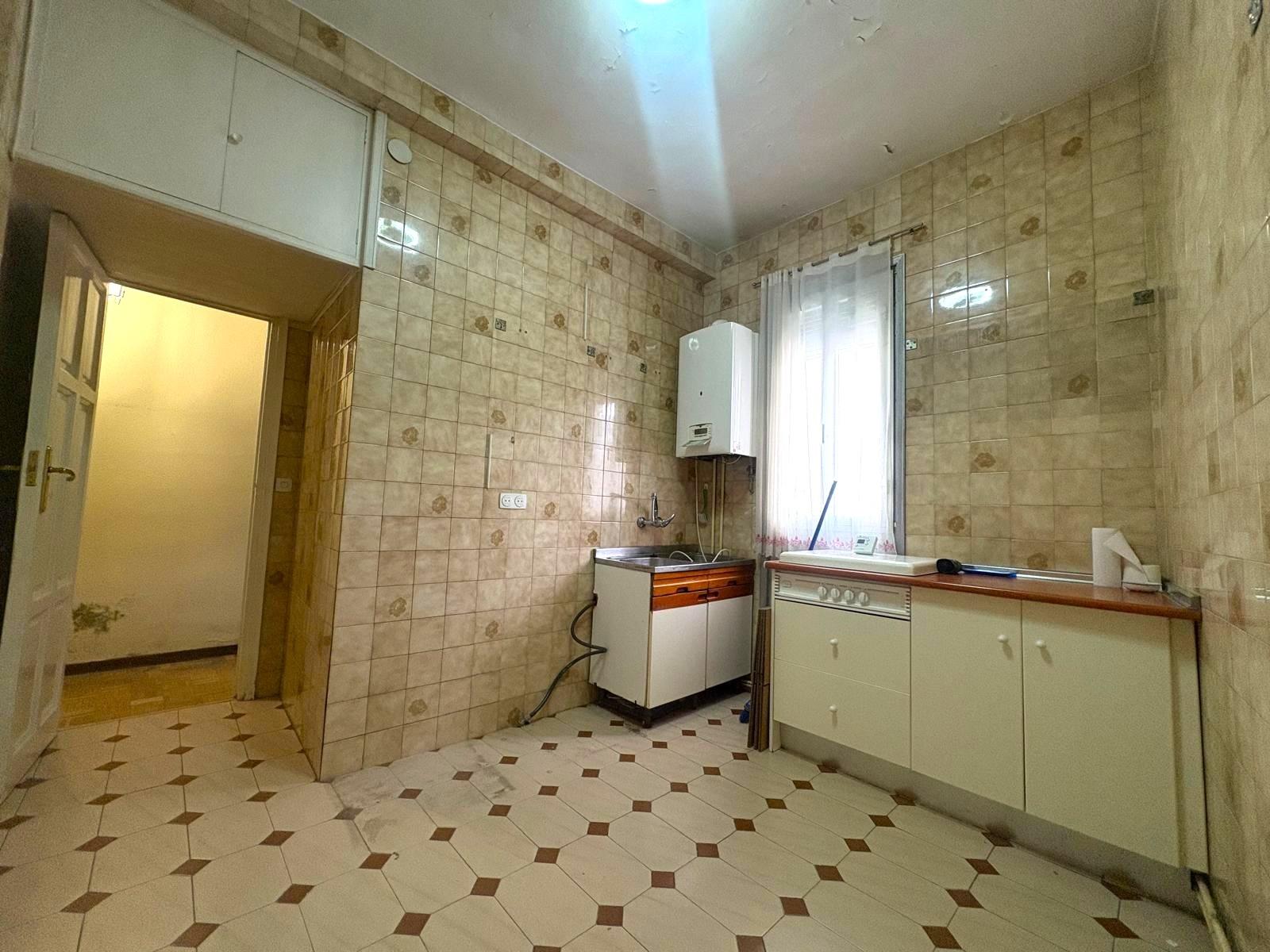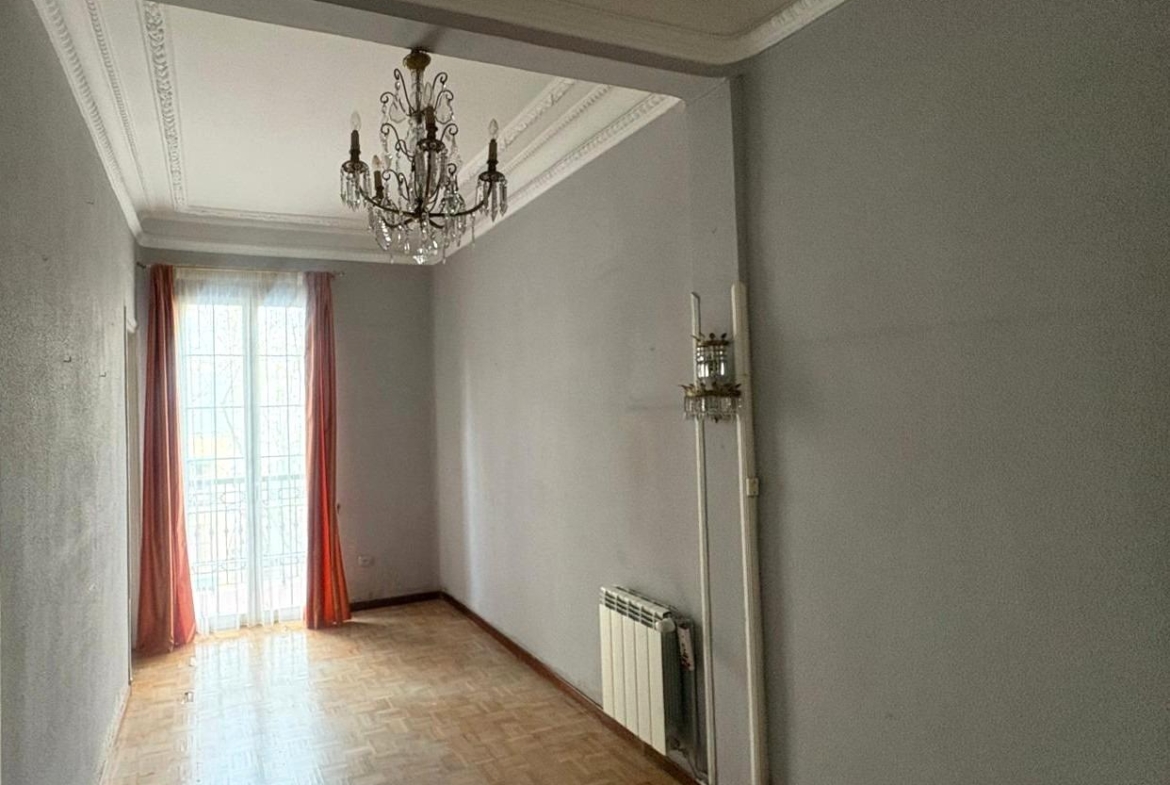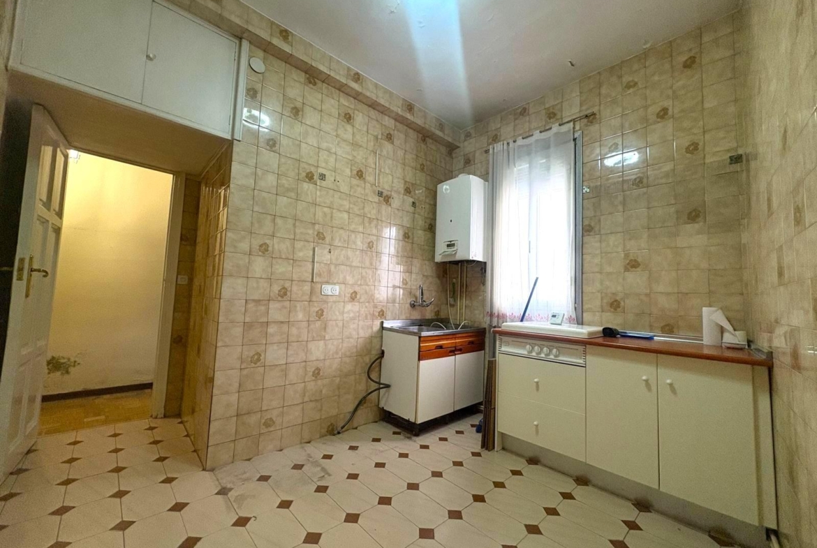 Su distribución actual ofrece un amplio salón con balcón, tres dormitorios (uno con acceso al segundo balcón) y una cocina independiente y espaciosa con ventana.