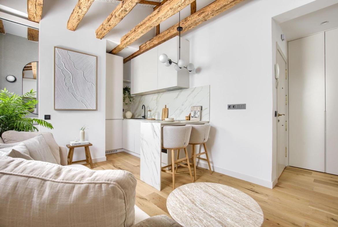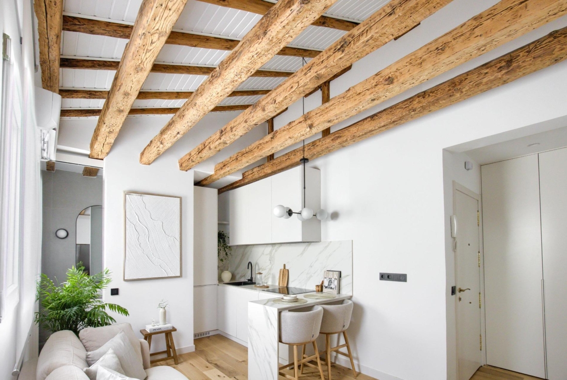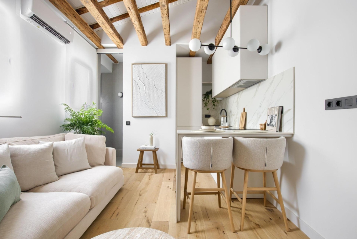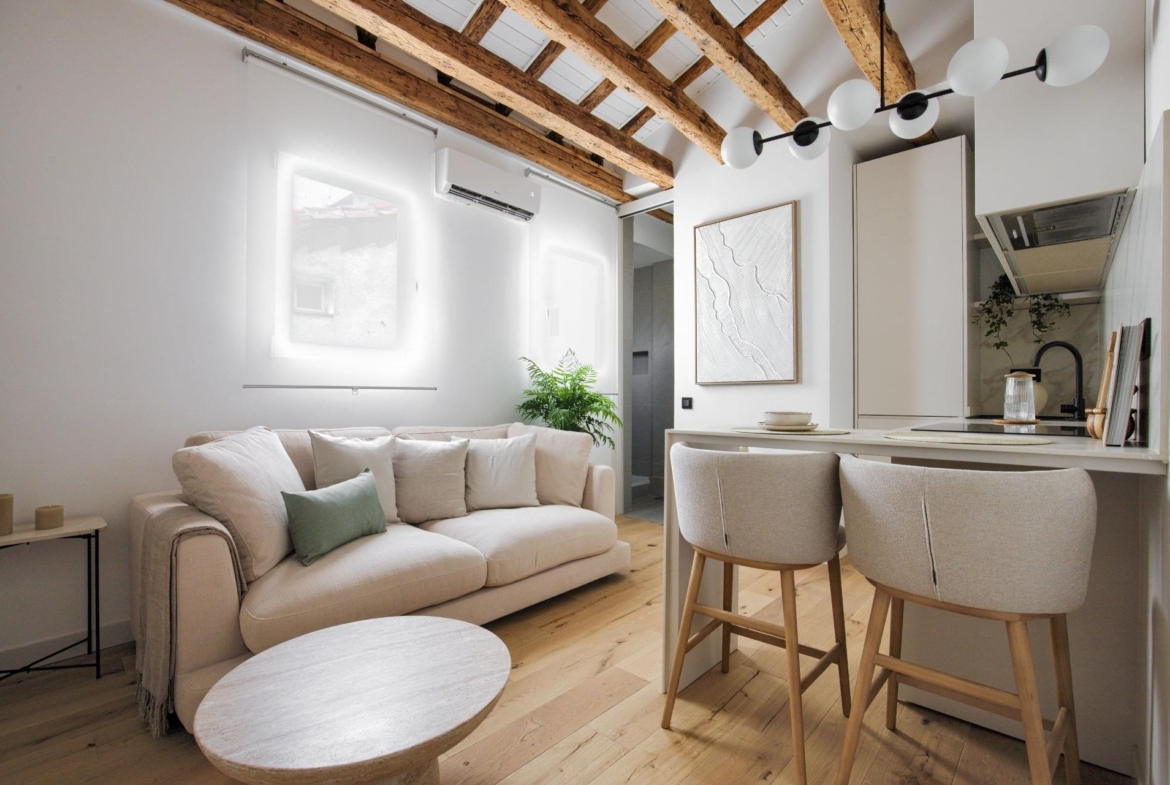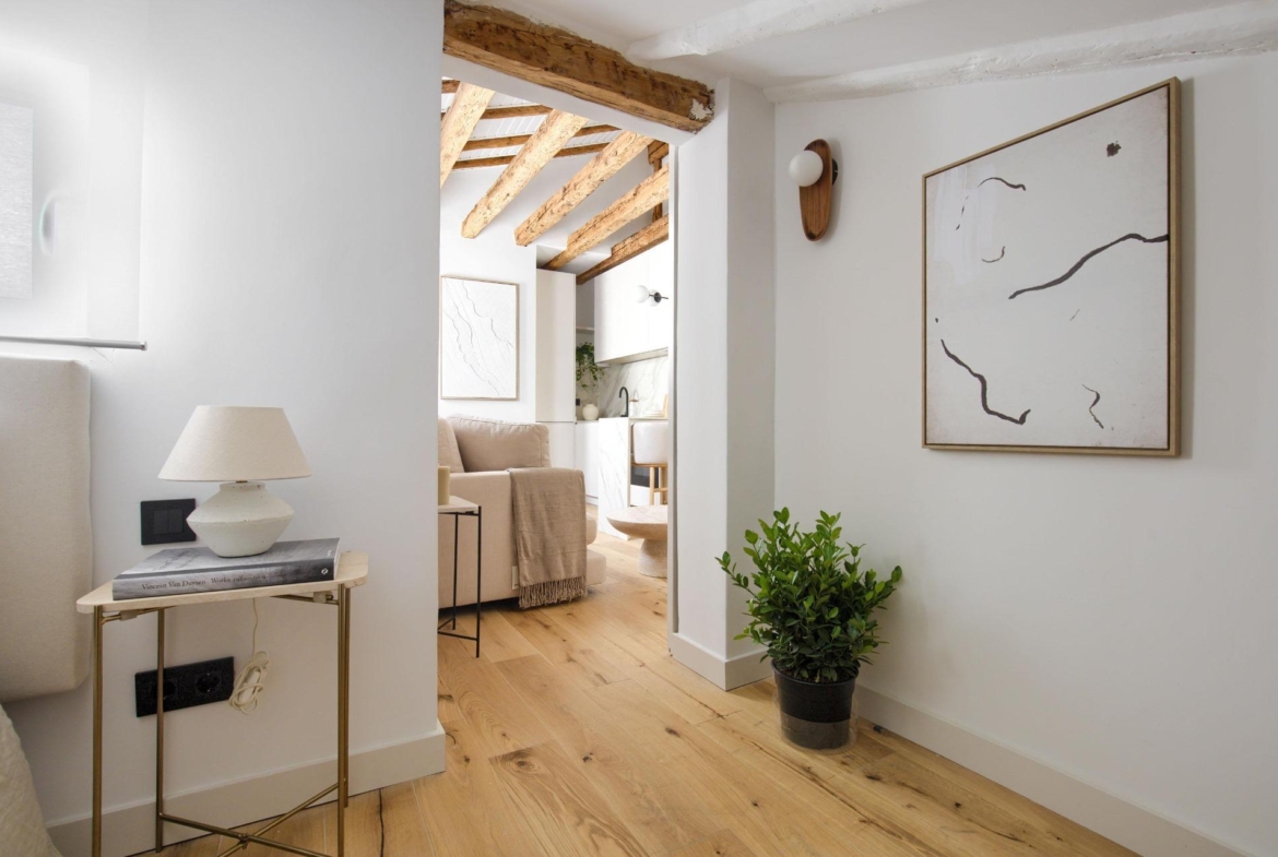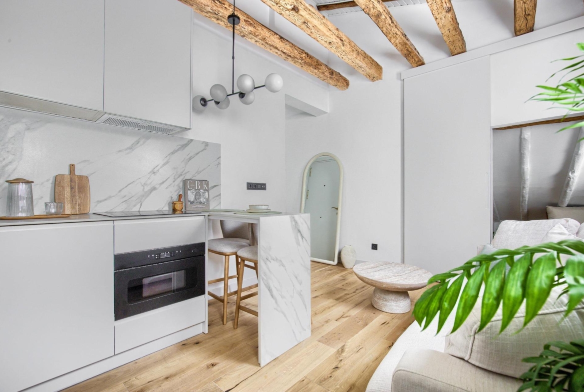 Ubicado en la cuarta planta de una finca en buen estado, esta vivienda de 41 m² ha sido cuidadosamente renovada, conservando elementos originales como sus vigas de madera vistas, que aportan calidez, personalidad y un aire acogedor.