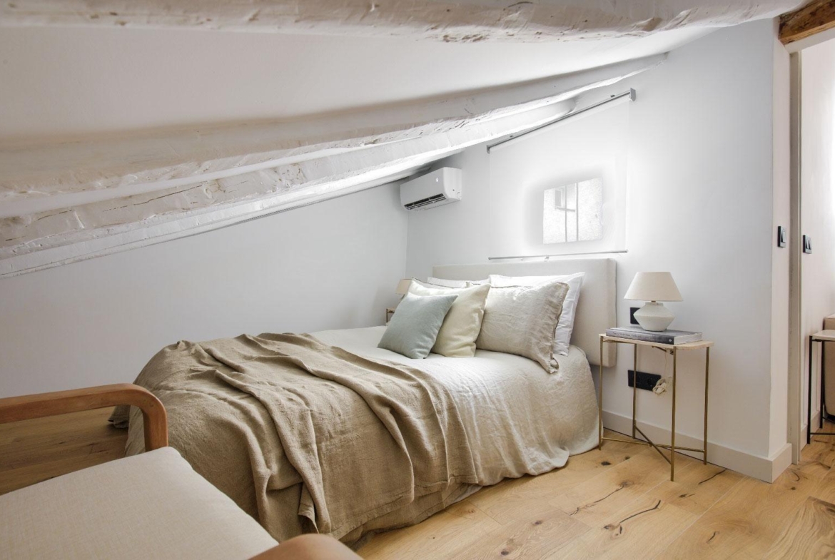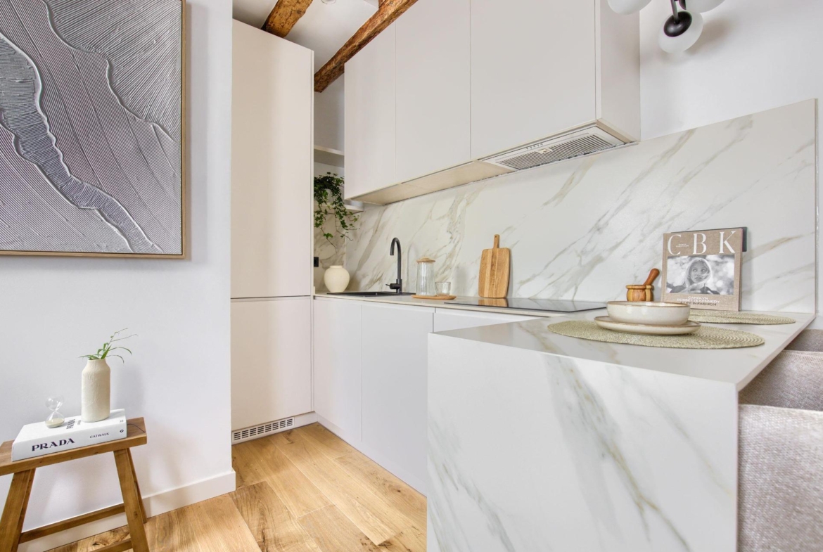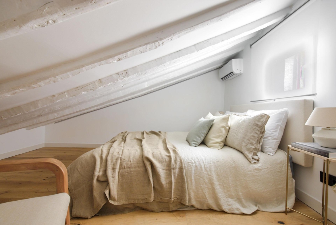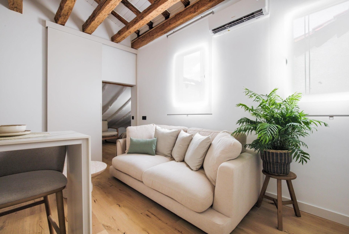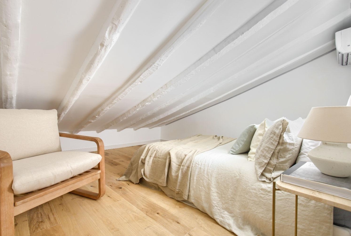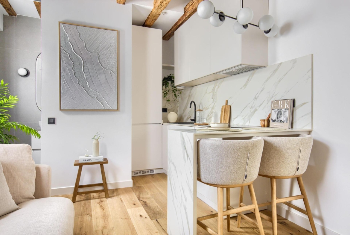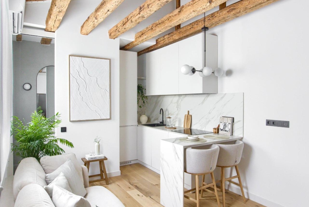 Ubicado en la cuarta planta de una finca en buen estado, esta vivienda de 41 m² ha sido cuidadosamente renovada, conservando elementos originales como sus vigas de madera vistas, que aportan calidez, personalidad y un aire acogedor.