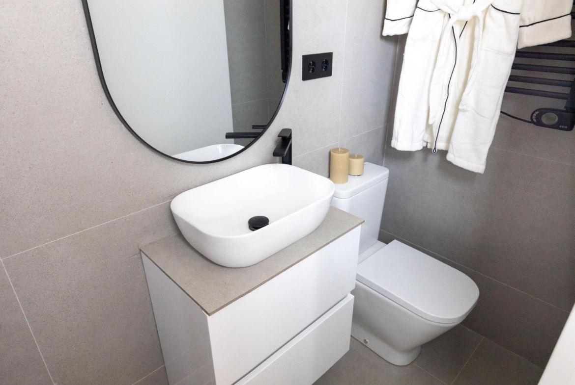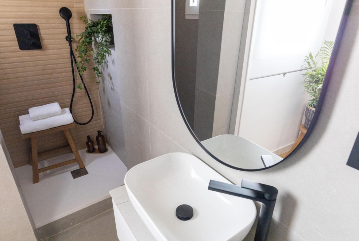 La cocina, completamente amueblada y equipada, cuenta con una práctica barra desayunador que optimiza el espacio y se integra perfectamente al estilo moderno de la vivienda. El dormitorio, de estilo abuhardillado, es íntimo y acogedor, ideal para el descanso. Un cuarto de baño es completo y cuenta con plato de ducha y acabados actuales, funcionales y de buen gusto.